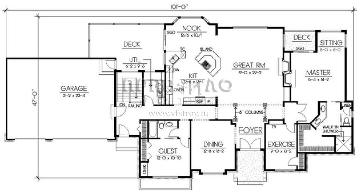 S5-414 (692-00210) Это иностранный проект, для которого требуется адаптация под нормы, действующие в Российской Федерации. Вы видите проект дома в современном стиле. В этом доме сочетаются черты сельской постройки и аскетичность лофта. Внутри жильцы смогут проводить время с максимальным комфортом. Обратим внимание, что сейчас на планировках все размеры представлены в футах. Для перевода в метры вам необходимо значение в футах умножить на 0,3048.