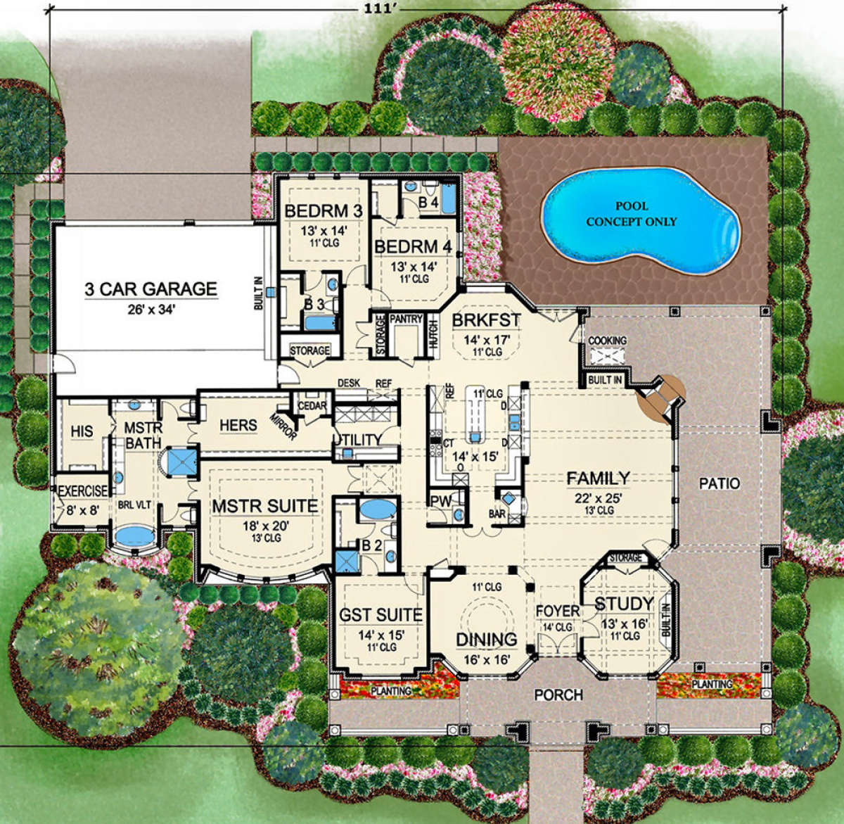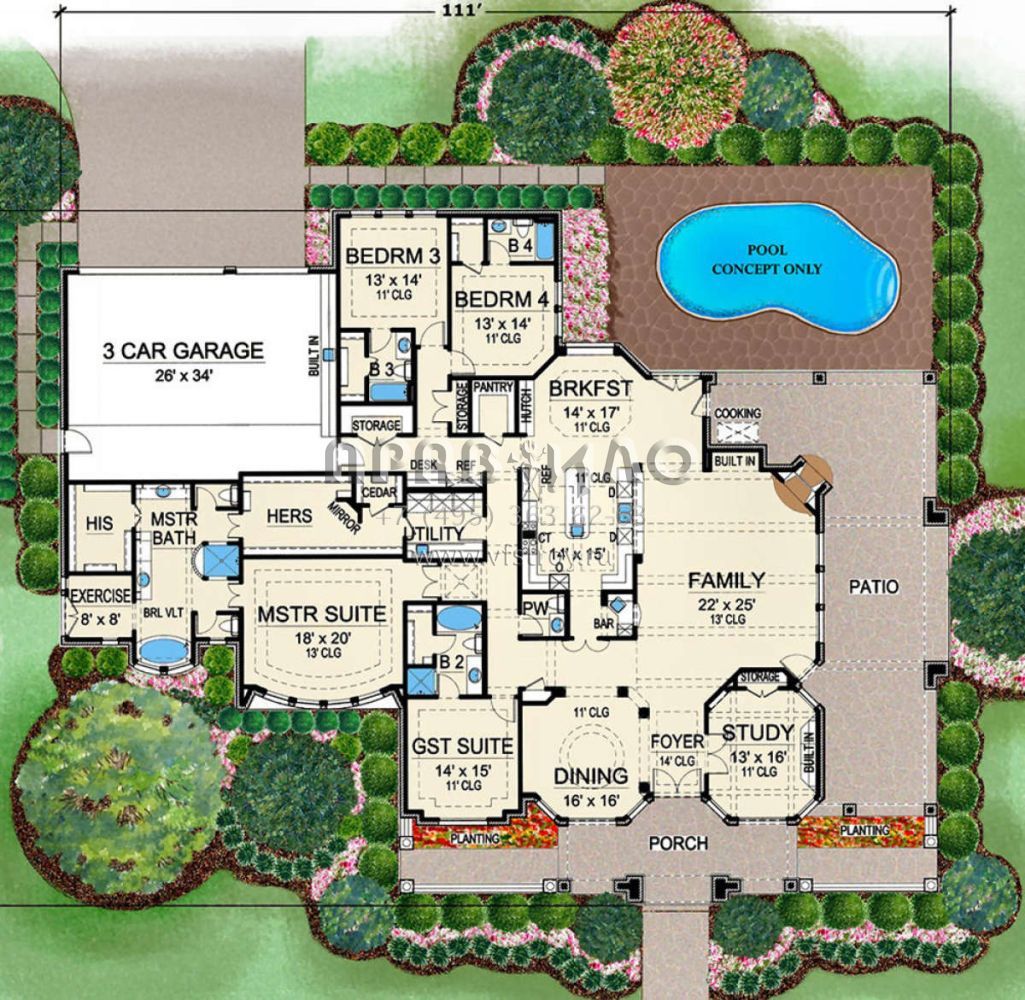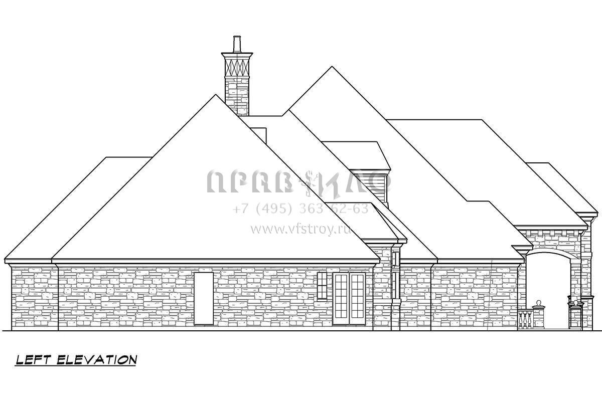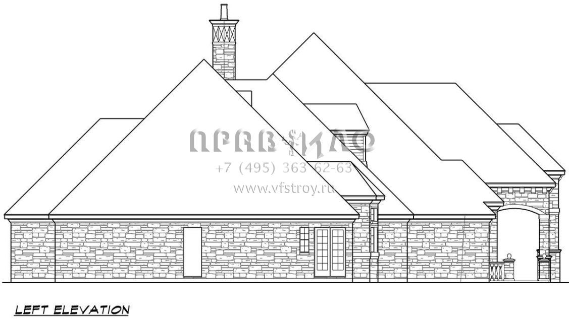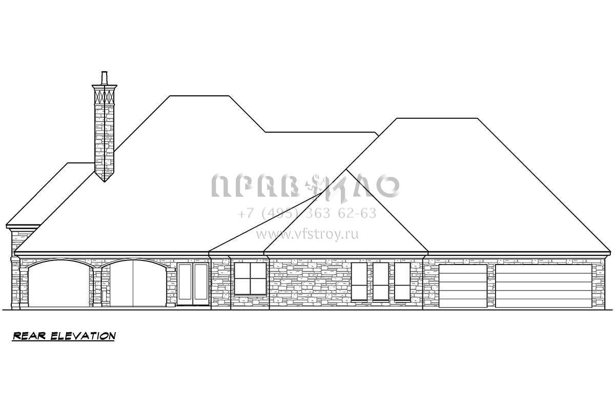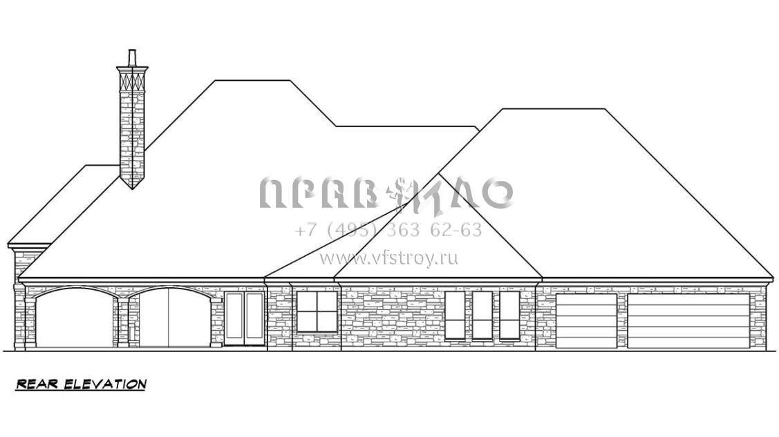 Это проект одноэтажного дома с гаражом на три и более машин жилой площадью 421 кв.м. Длина дома 26.5 м, ширина 33.8 м, высота 12.2 м. В доме четыре спальни и четыре санузла.