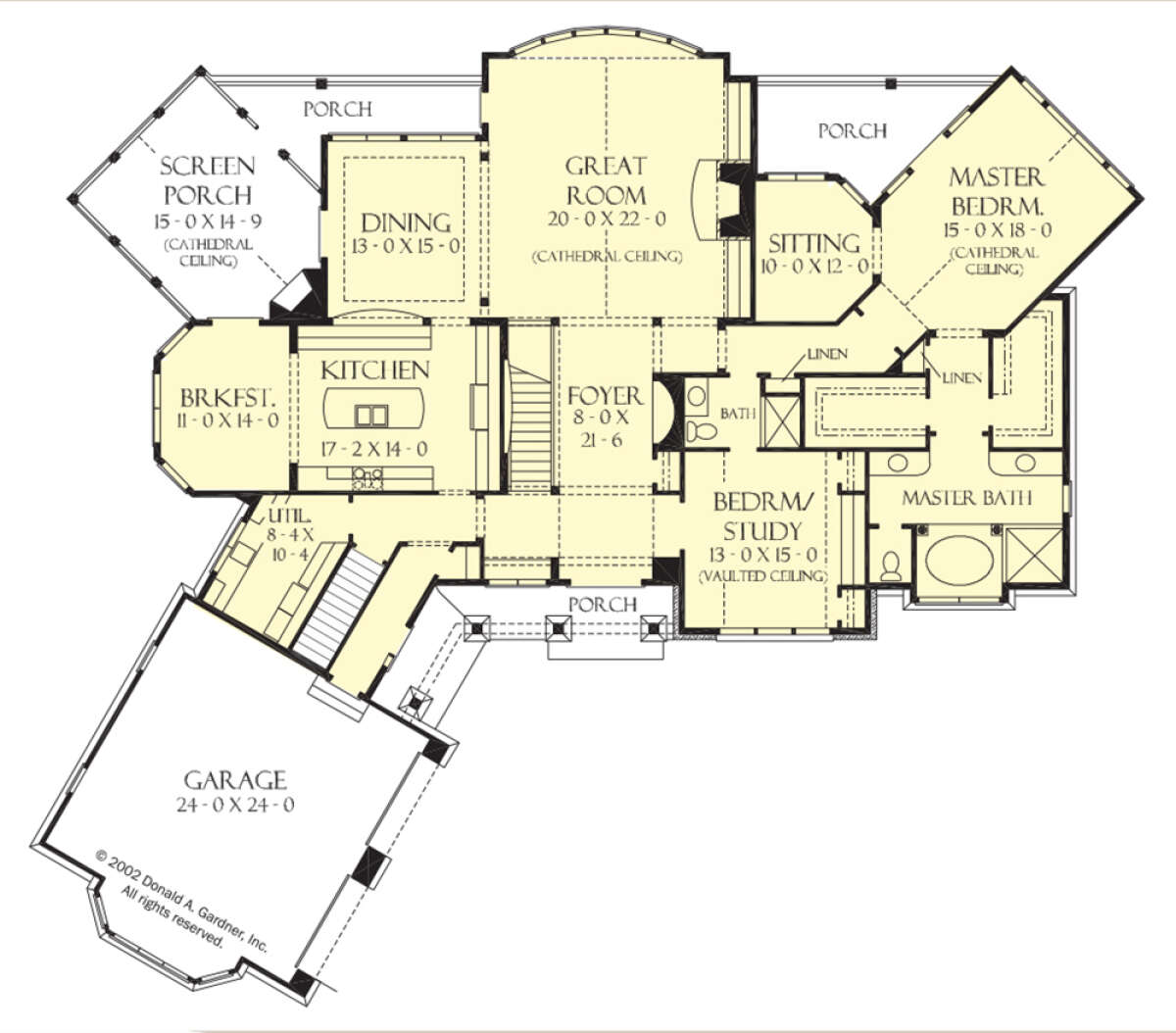 Это проект одноэтажного дома с гаражом на две машины жилой площадью 422 кв.м. Длина дома 24.4 м, ширина 28.3 м, высота 9.1 м. В доме четыре спальни и четыре санузла.