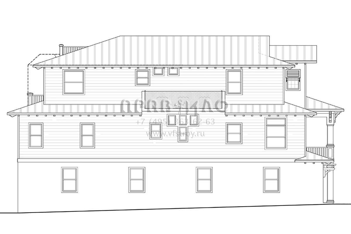 Это проект трехэтажного дома с гаражом на три и более машин жилой площадью 423 кв.м. Длина дома 22.3 м, ширина 23.5 м, высота 11.9 м. В доме три спальни и три санузла.