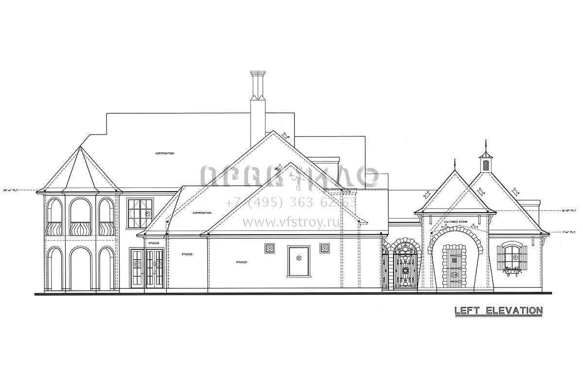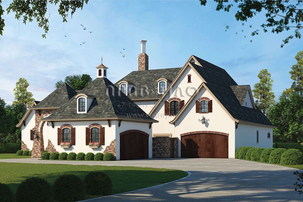 Это проект двухэтажного дома с гаражом на три и более машин жилой площадью 430 кв.м. Длина дома 31.1 м, ширина 25.6 м, высота 11.3 м. В доме четыре спальни и четыре санузла.