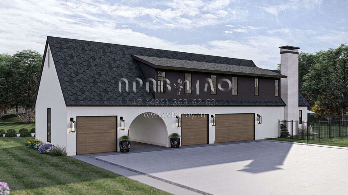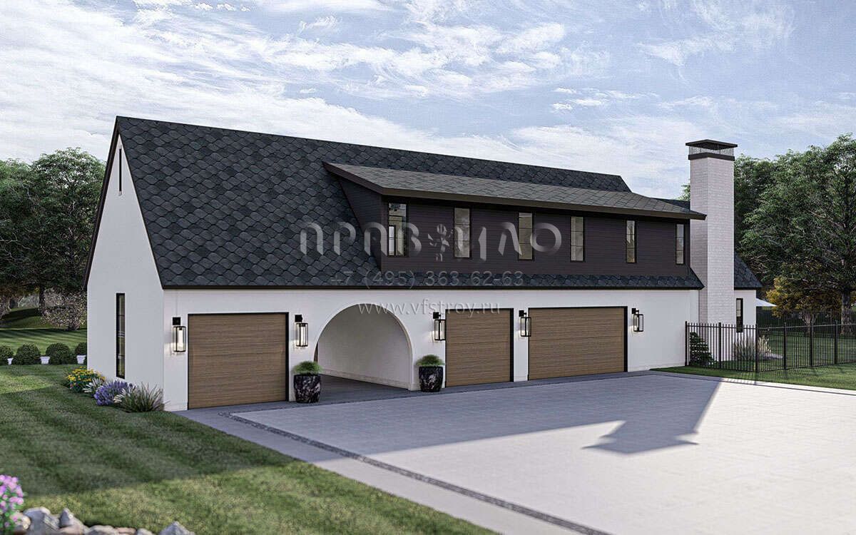 Это проект двухэтажного дома с гаражом на три и более машин жилой площадью 438 кв.м. Длина дома 28.7 м, ширина 30.8 м, высота 8.5 м. В доме пять спален и три санузла.