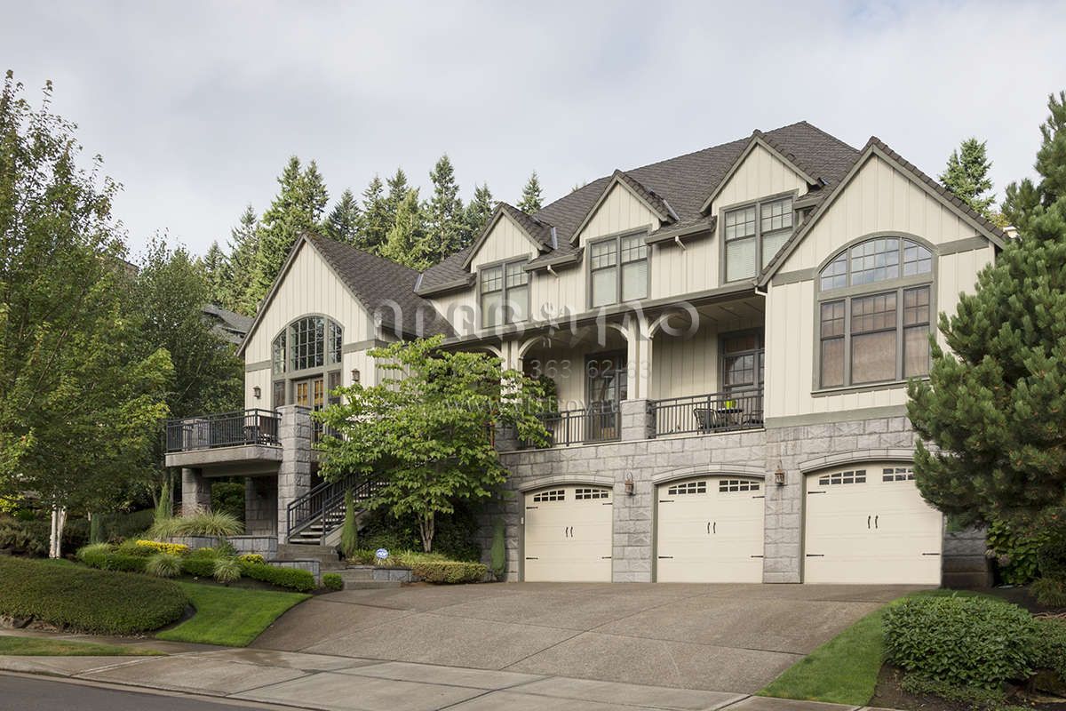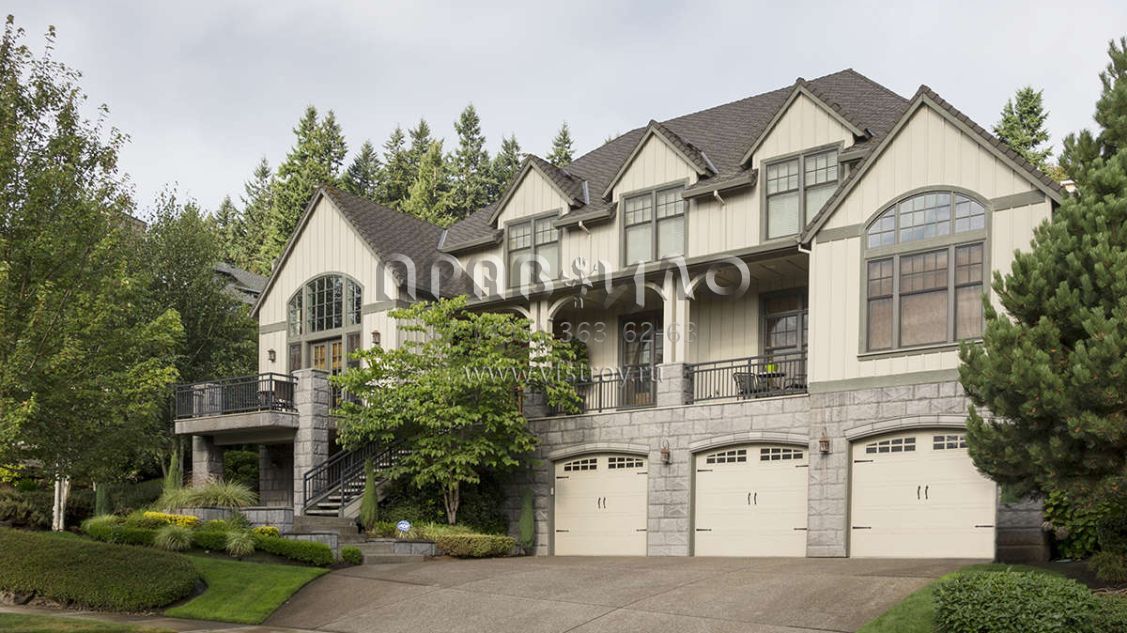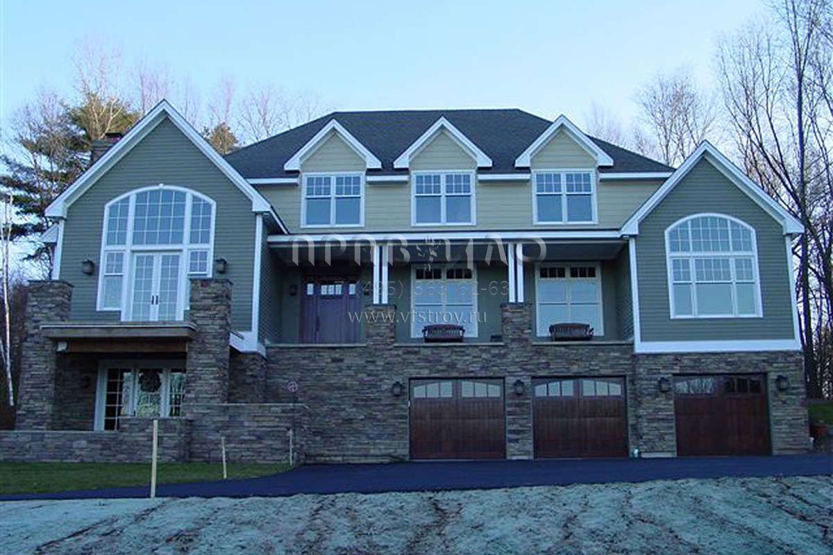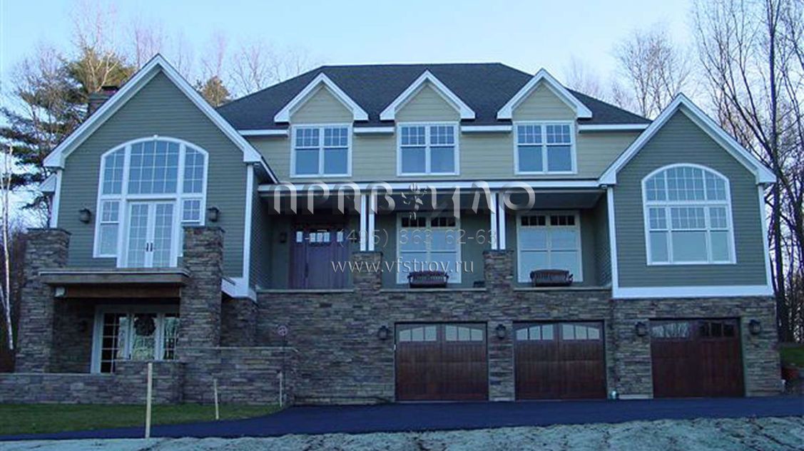 Это проект двухэтажного дома с гаражом на три и более машин жилой площадью 442 кв.м. Длина дома 15.2 м, ширина 21.9 м, высота 10.4 м. В доме четыре спальни и три санузла.