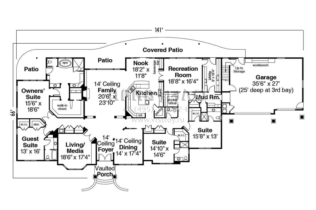 Поскольку этот проект разрабатывался иностранными архитекторами, для строительства дома требуется переработка проекта под действующие в России нормы. Данные визуализации проекта представлены для ознакомления с концепцией проекта. Проект разработан американским архитектурным бюро и представлен America's Best House Plans.