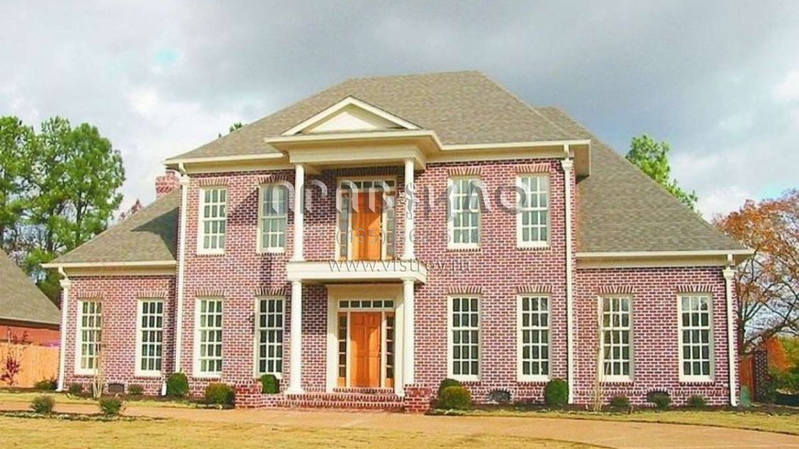 Это проект двухэтажного дома с гаражом на три и более машин жилой площадью 465 кв.м. Длина дома 27.4 м, ширина 21.3 м, высота 11.9 м. В доме пять спален и четыре санузла.
