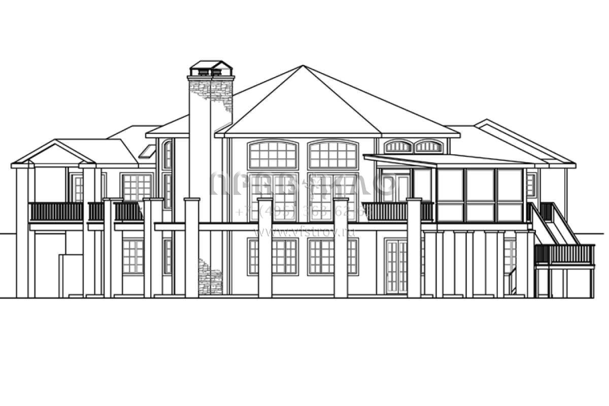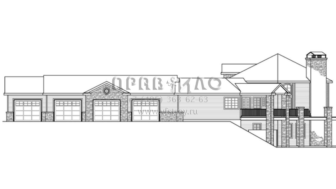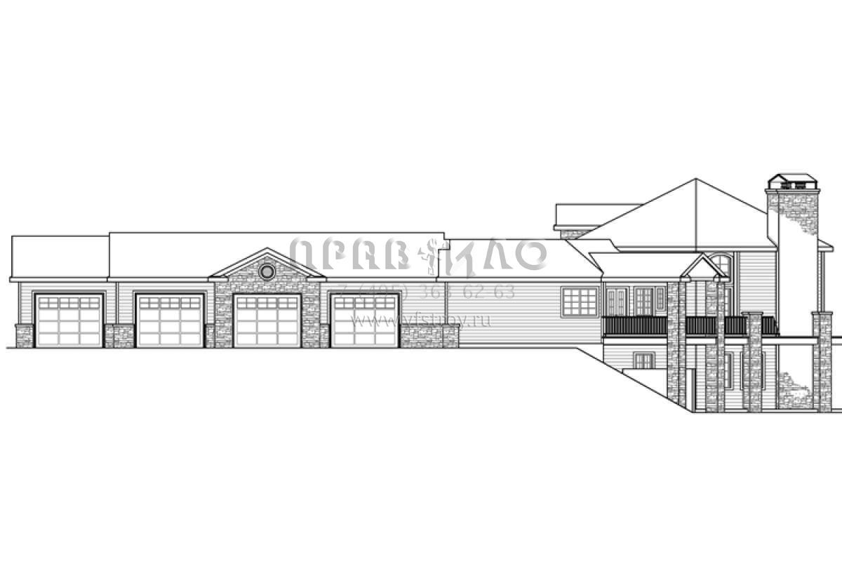 Это проект двухэтажного дома с гаражом на три и более машин жилой площадью 488 кв.м. Длина дома 37.8 м, ширина 24.7 м, высота 7.6 м. В доме три спальни и три санузла.