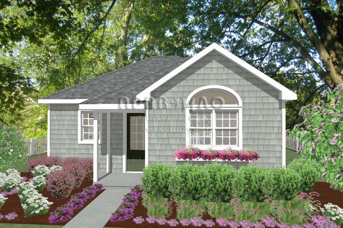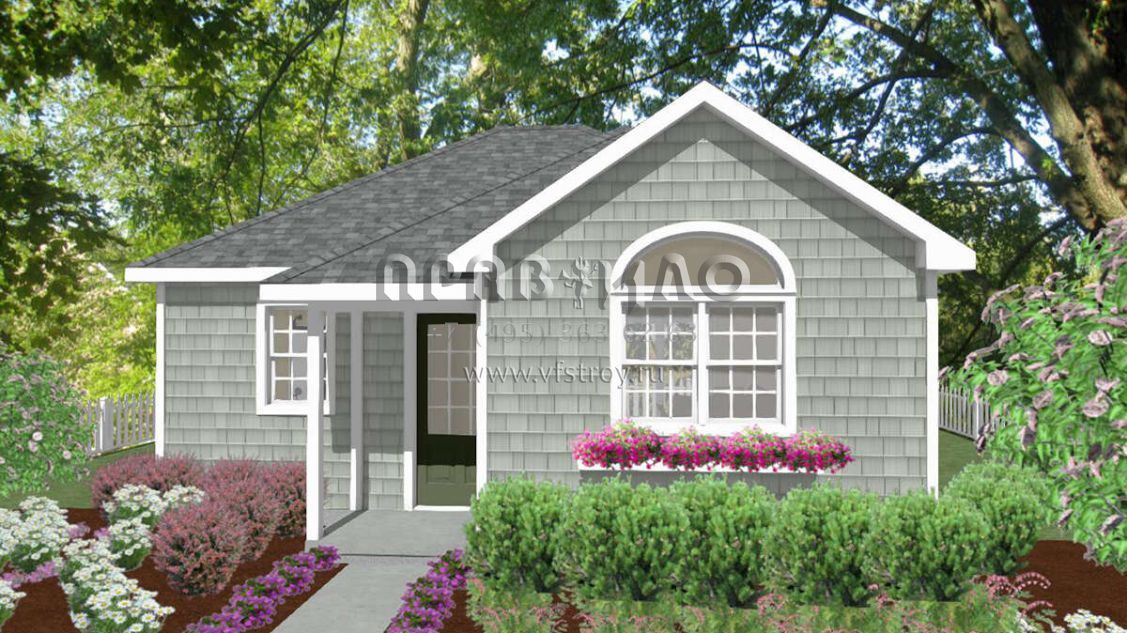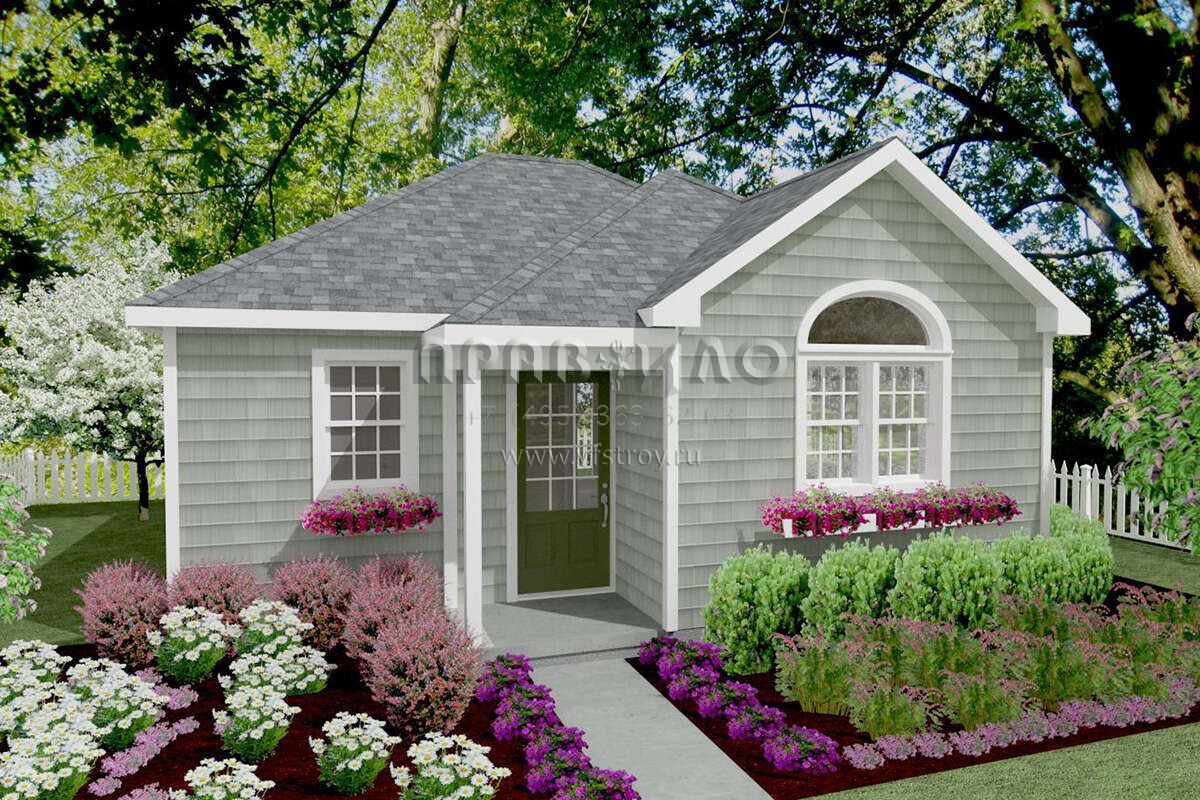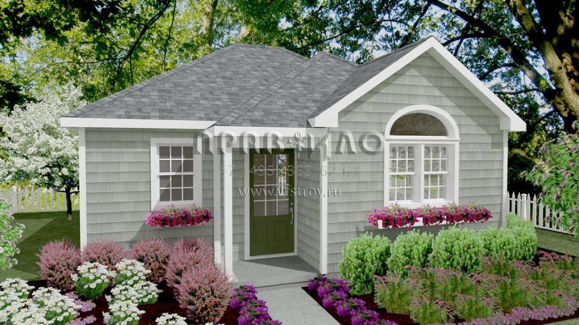 Это проект одноэтажного дома без гаража жилой площадью 49 кв.м. Длина дома 7.3 м, ширина 7.3 м, высота 4.6 м. В доме одна спальня и один санузел.