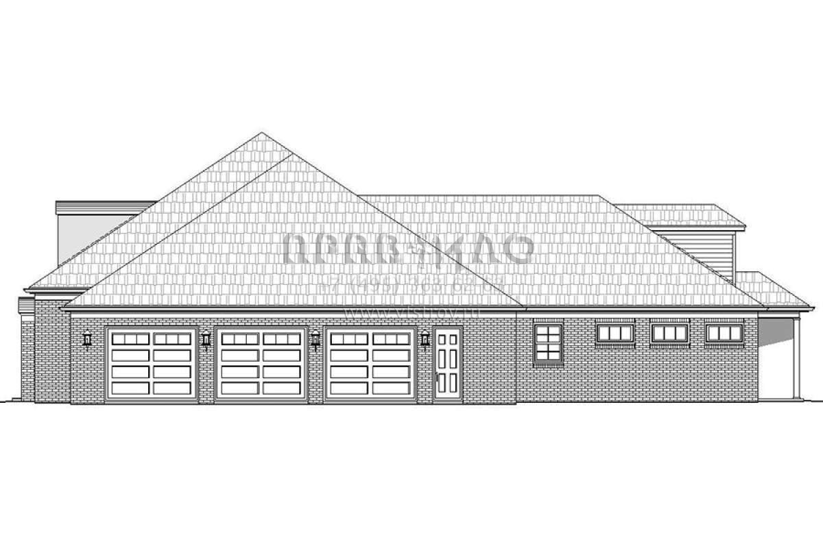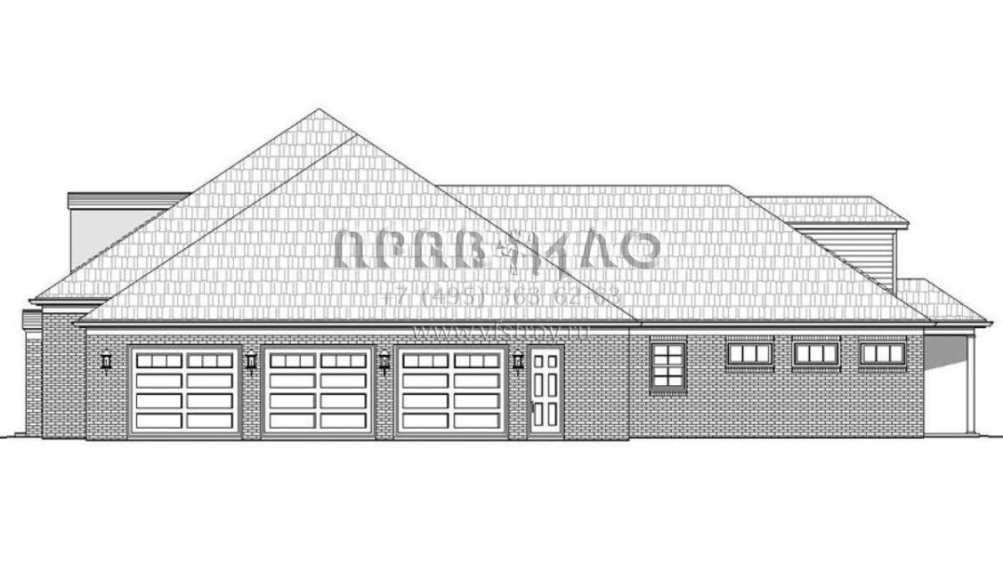 Это проект двухэтажного дома с гаражом на три и более машин жилой площадью 506 кв.м. Длина дома 25.9 м, ширина 26.2 м, высота 8.8 м. В доме пять спален и шесть и более санузлов.