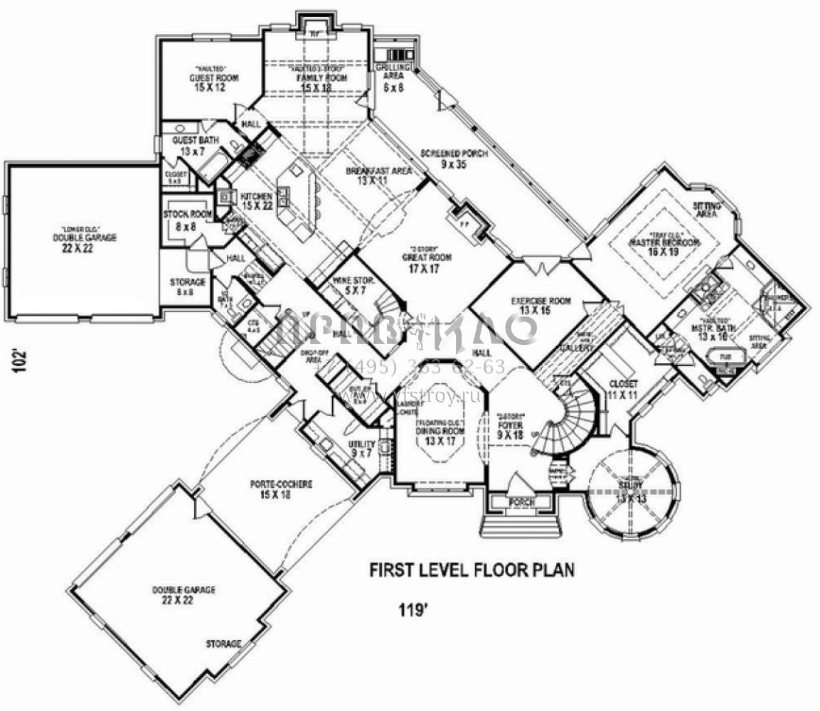 S5-518 (053-02570) Это иностранный проект, для которого требуется адаптация под нормы, действующие в Российской Федерации. Вы видите проект дома в стиле Ранчо. В этом доме сочетаются черты сельской постройки и аскетичность лофта. Внутри жильцы смогут проводить время с максимальным комфортом. Обратим внимание, что сейчас на планировках все размеры представлены в футах. Для перевода в метры вам необходимо значение в футах умножить на 0,3048.
