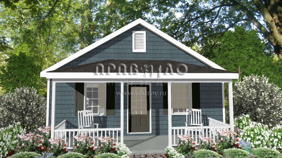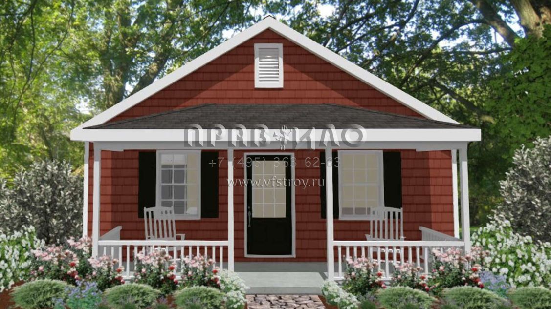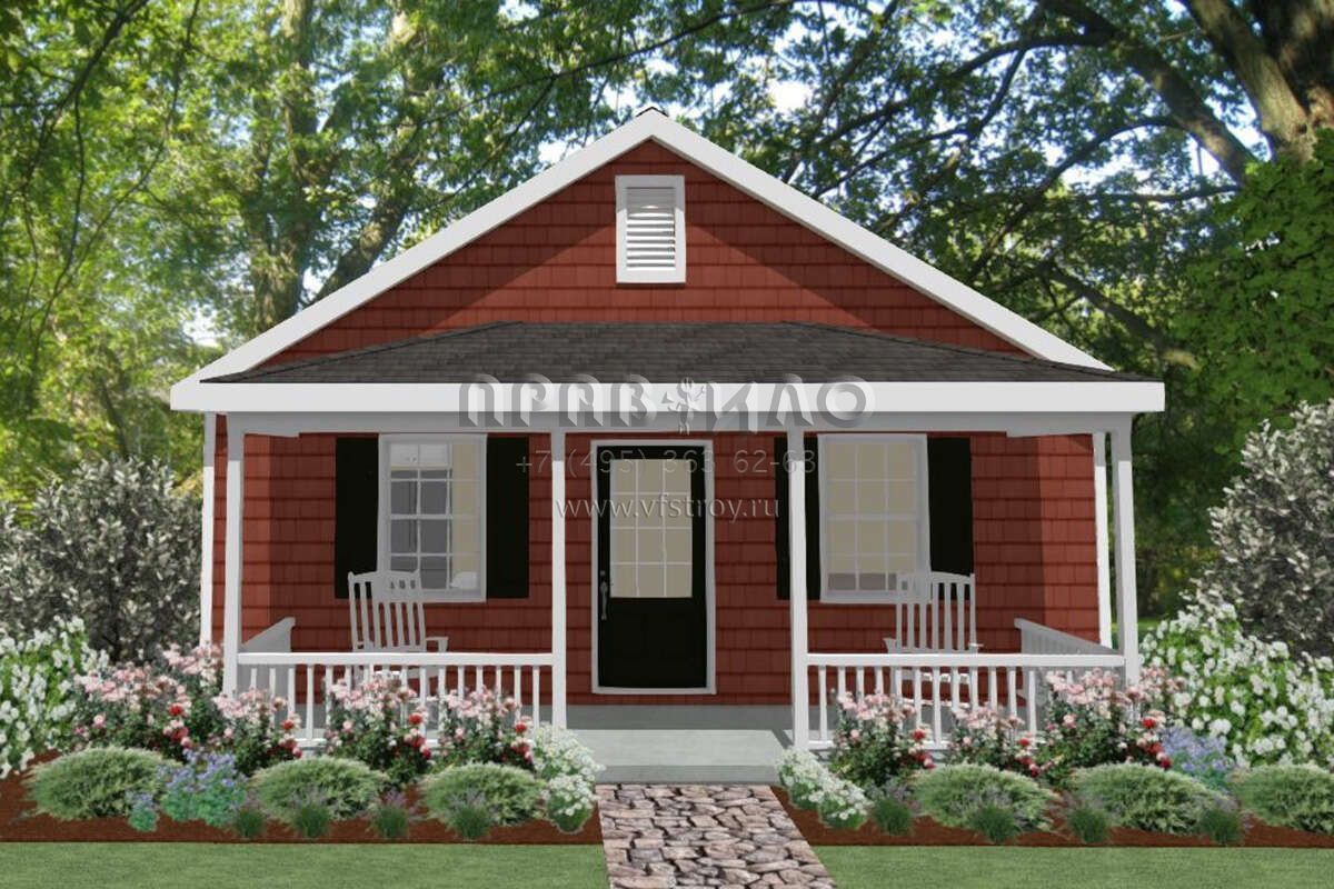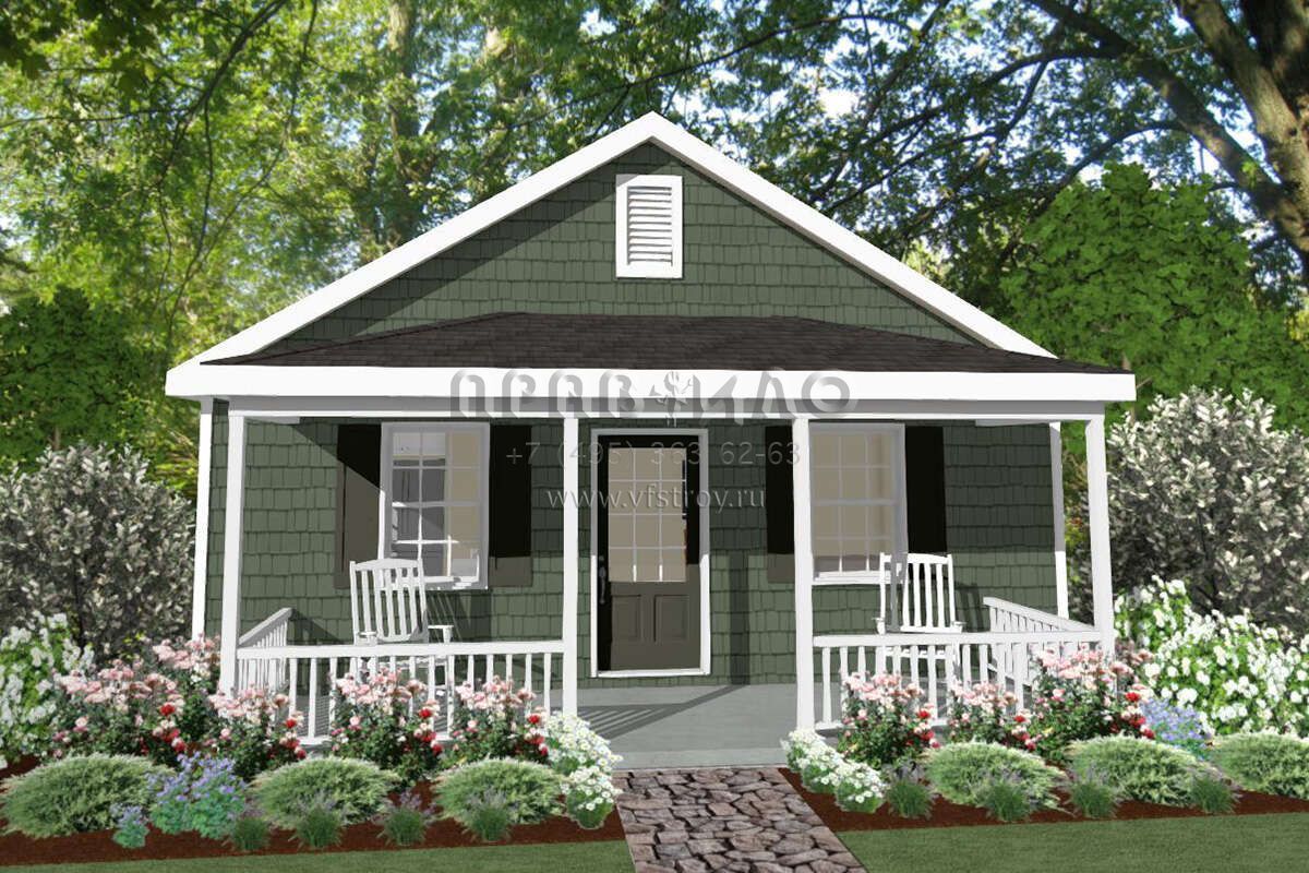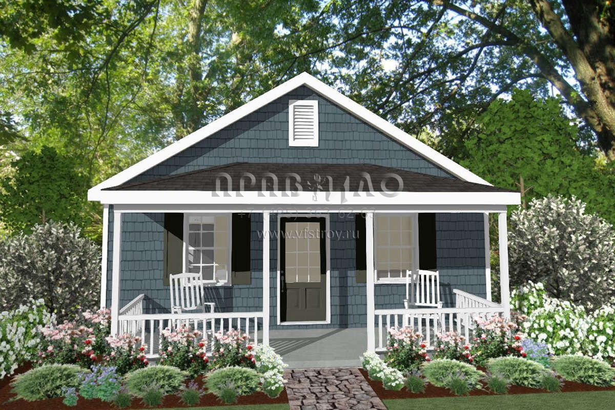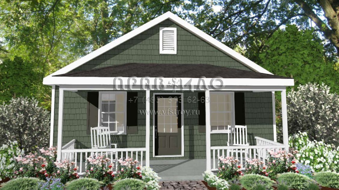Это проект одноэтажного дома без гаража жилой площадью 54 кв.м. Длина дома 9.1 м, ширина 7.3 м, высота 4.6 м. В доме одна спальня и один санузел.