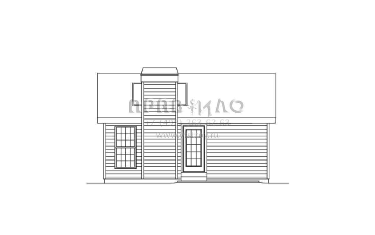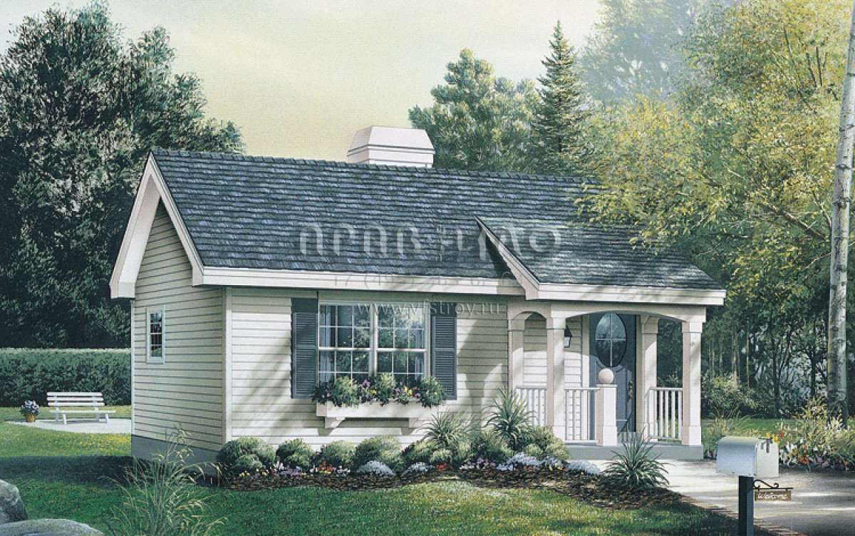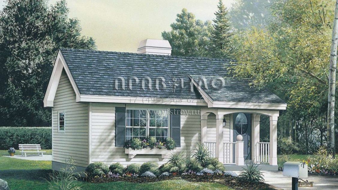 Это проект одноэтажного дома без гаража жилой площадью 54 кв.м. Длина дома 9.1 м, ширина 7.3 м, высота 4.6 м. В доме одна спальня и один санузел.