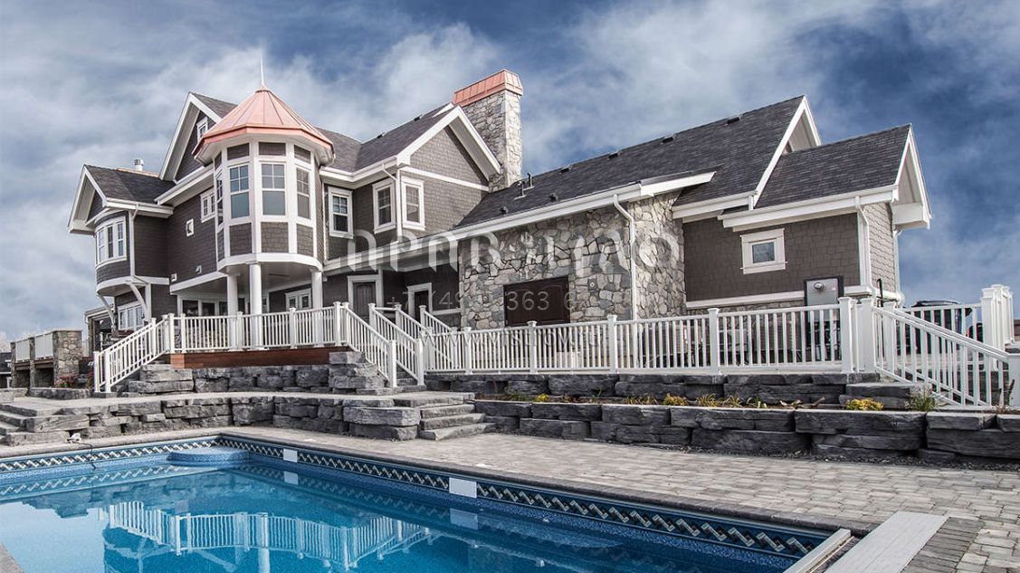 Это проект двухэтажного дома с гаражом на три и более машин жилой площадью 547 кв.м. Длина дома 27.1 м, ширина 41.8 м, высота 10.4 м. В доме четыре спальни и пять санузлов.