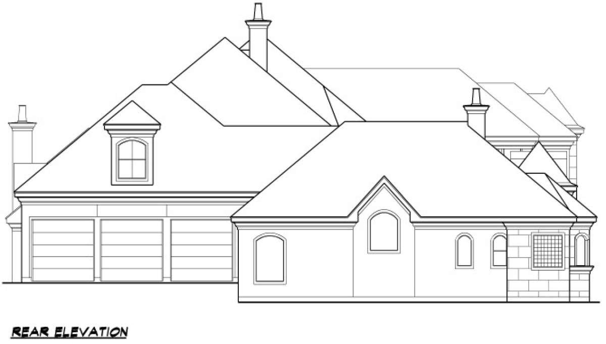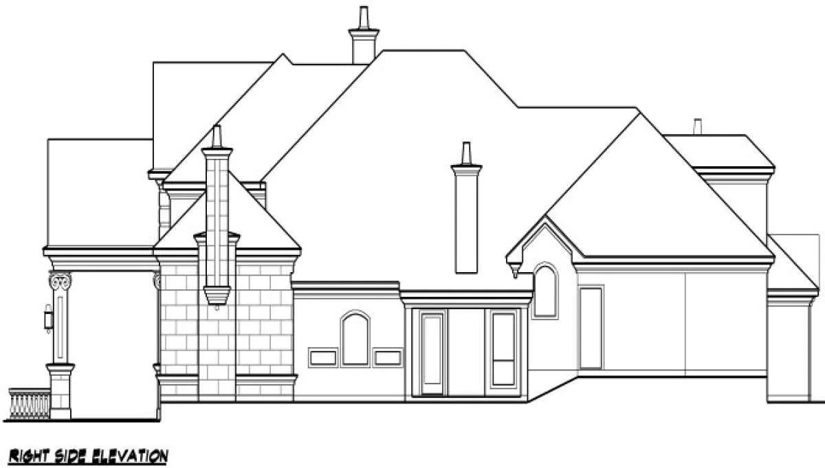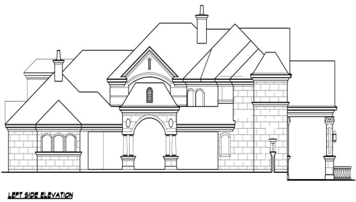 Это проект двухэтажного дома с гаражом на три и более машин жилой площадью 551 кв.м. Длина дома 32.3 м, ширина 25.6 м, высота 10.7 м. В доме пять спален и четыре санузла.