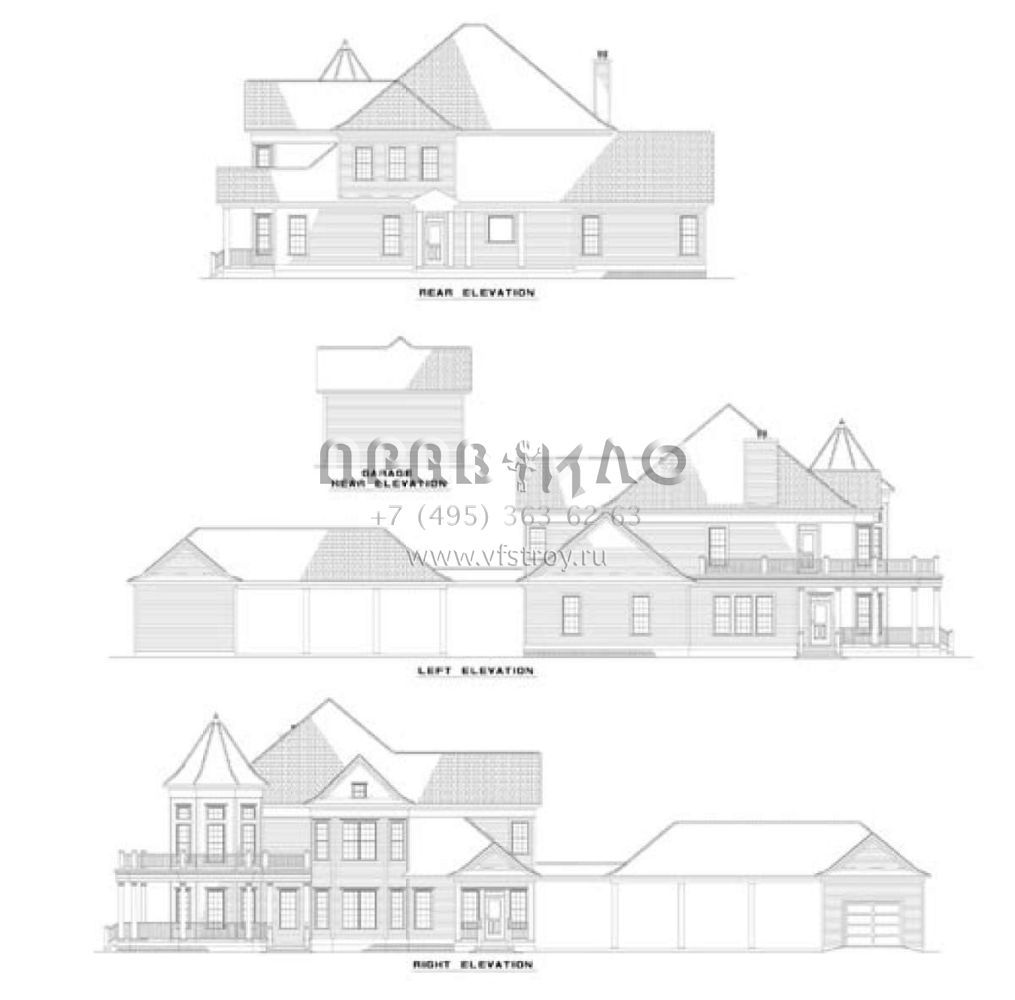 Это проект трехэтажного дома с гаражом на две машины жилой площадью 580 кв.м. Длина дома 38.4 м, ширина 22.9 м, высота 11.6 м. В доме три спальни и два санузла.