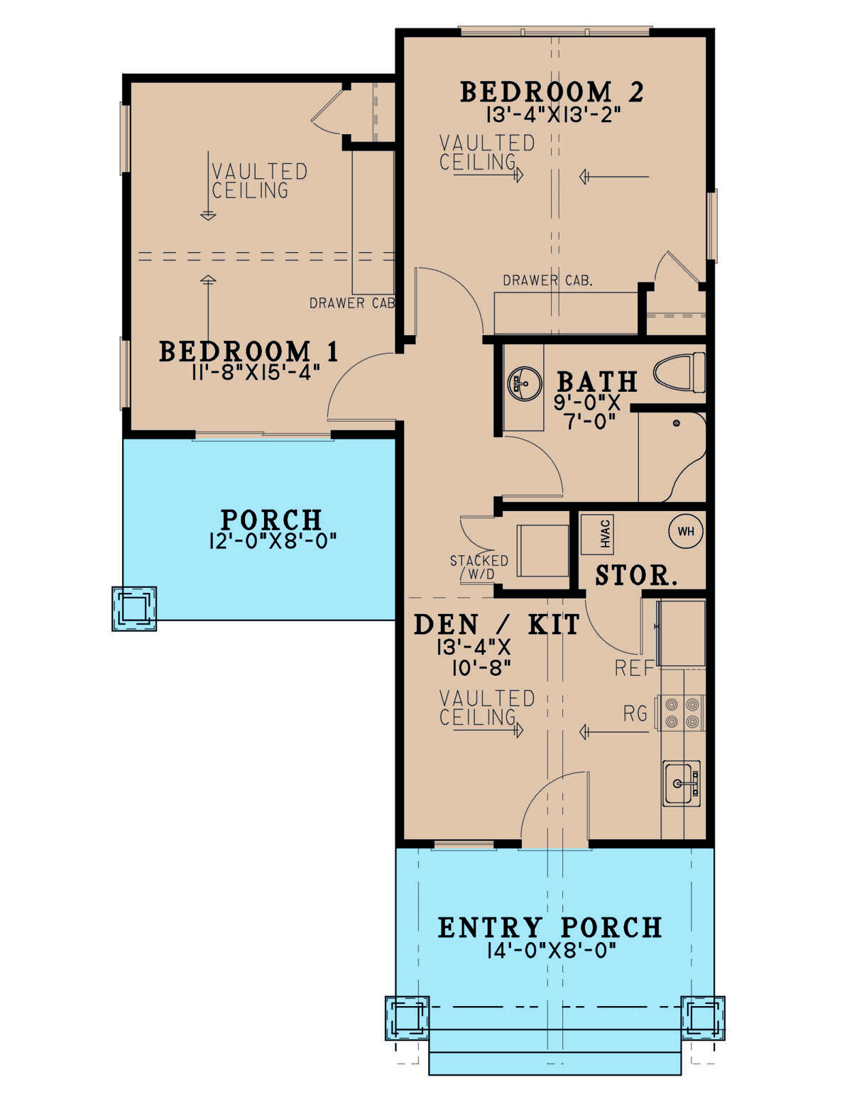 Это проект одноэтажного дома без гаража жилой площадью 65 кв.м. Длина дома 13.4 м, ширина 7.9 м, высота 5.5 м. В доме две спальни и один санузел.