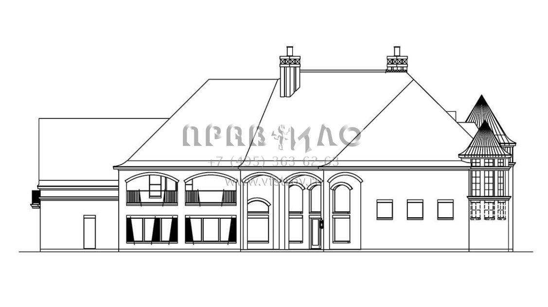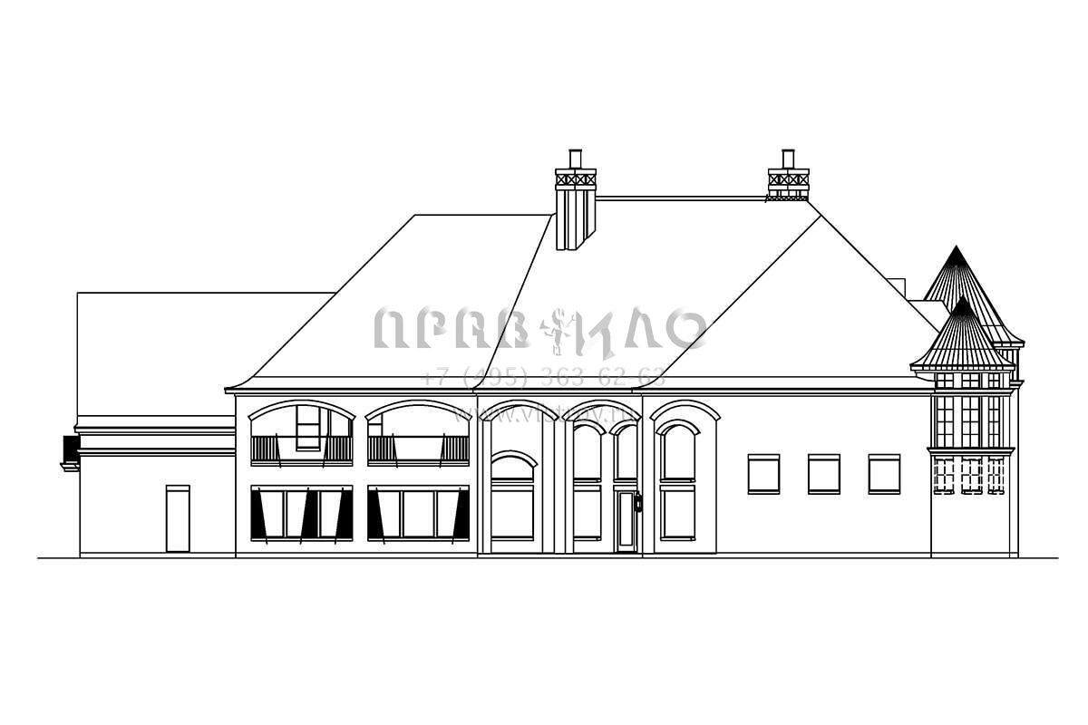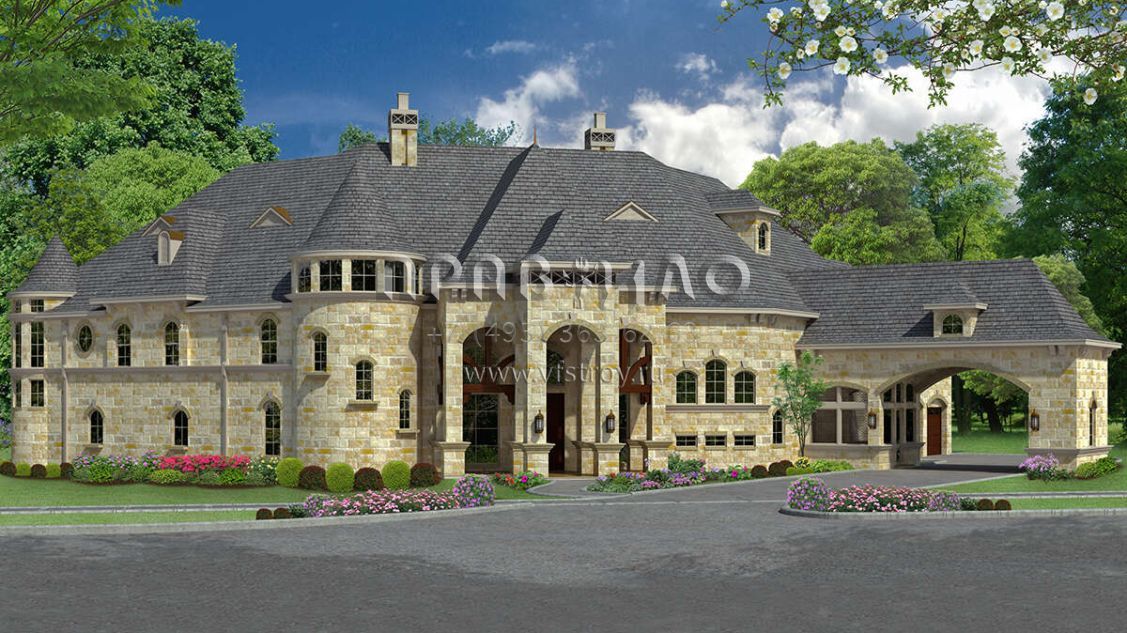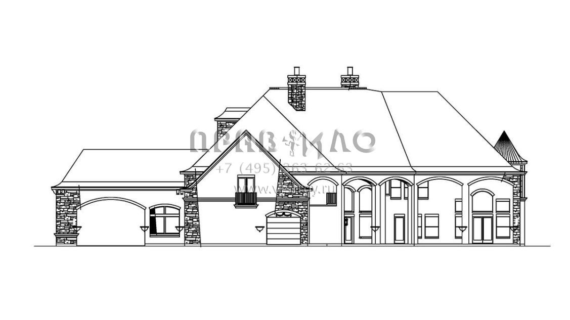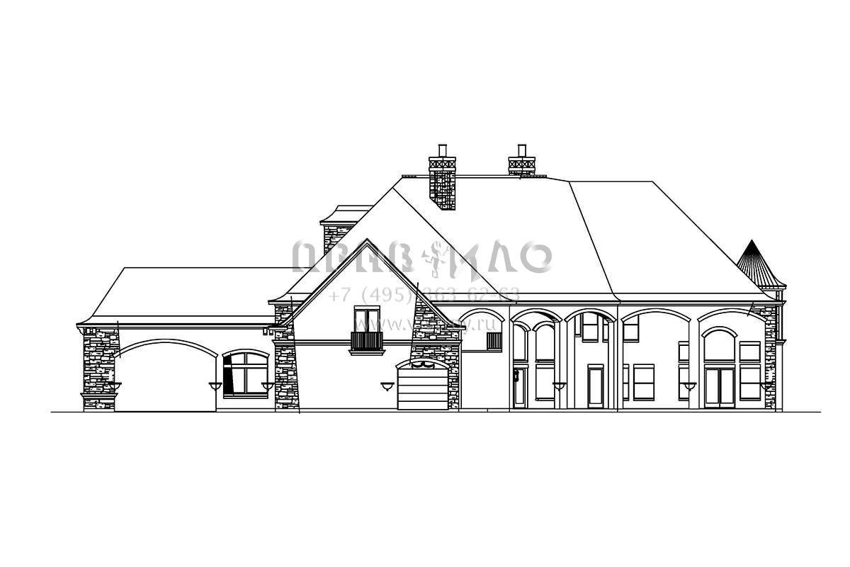 Это проект двухэтажного дома с гаражом на три и более машин жилой площадью 736 кв.м. Длина дома 31.1 м, ширина 46.6 м, высота 14 м. В доме четыре спальни и пять санузлов.