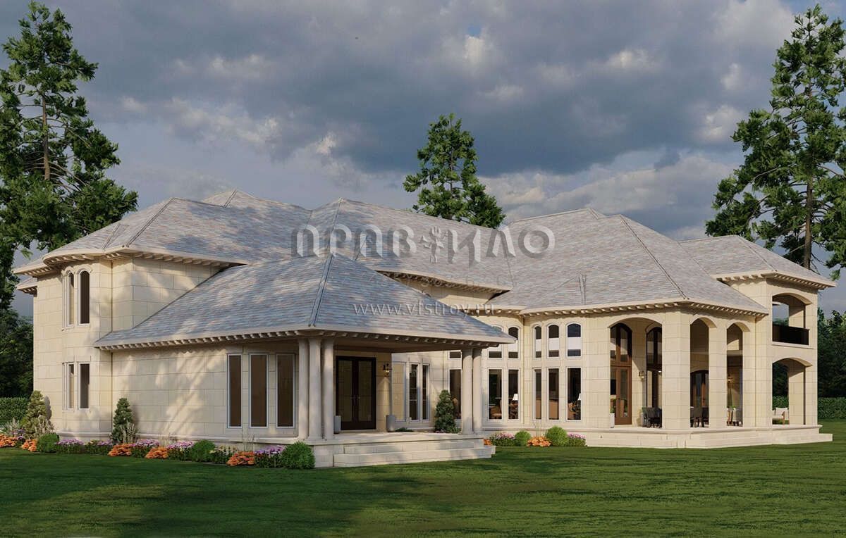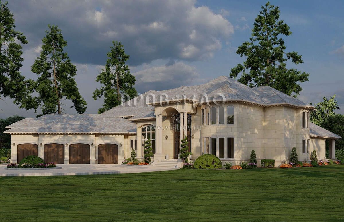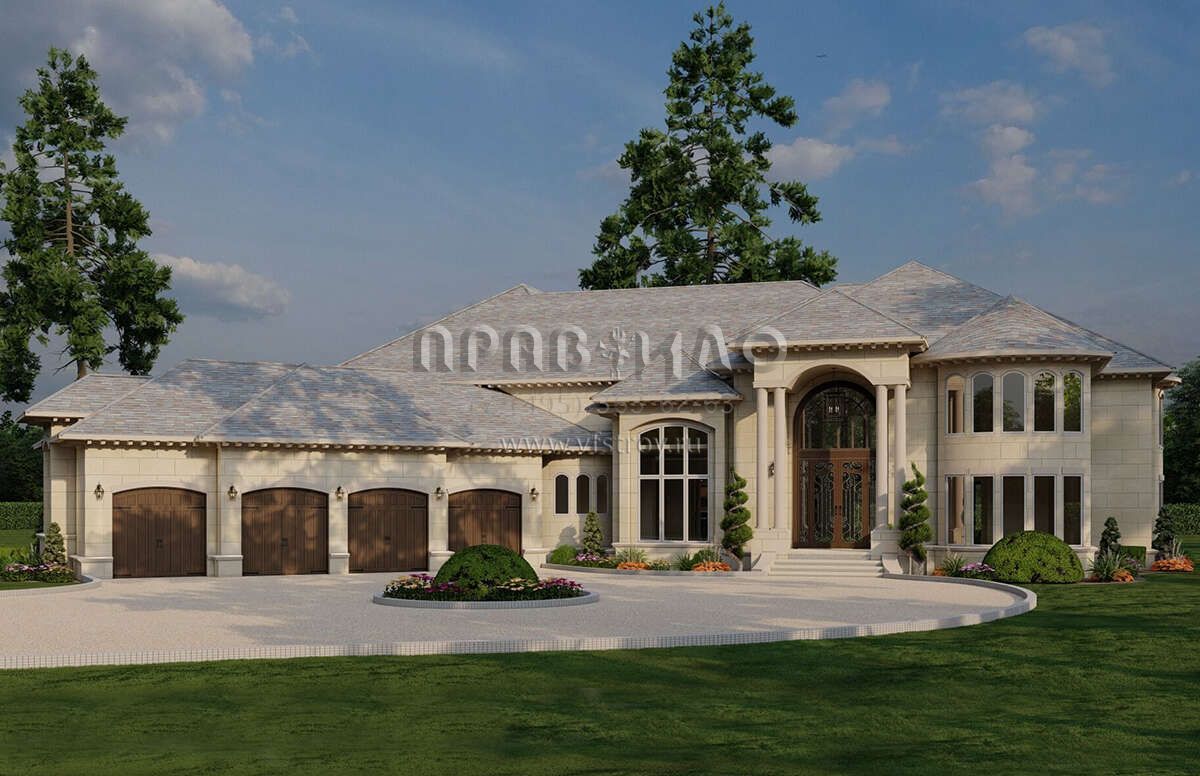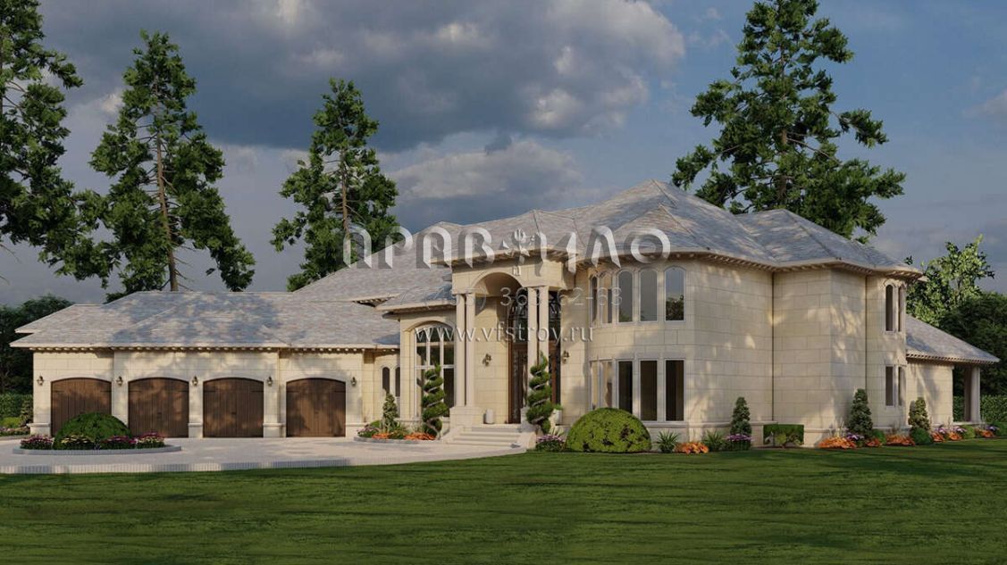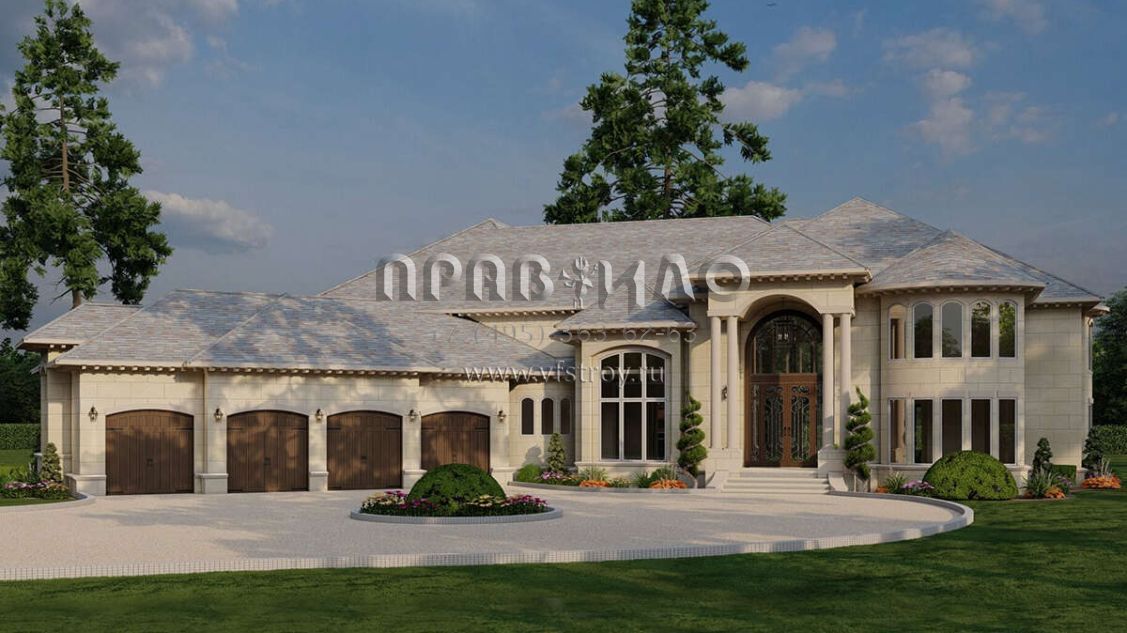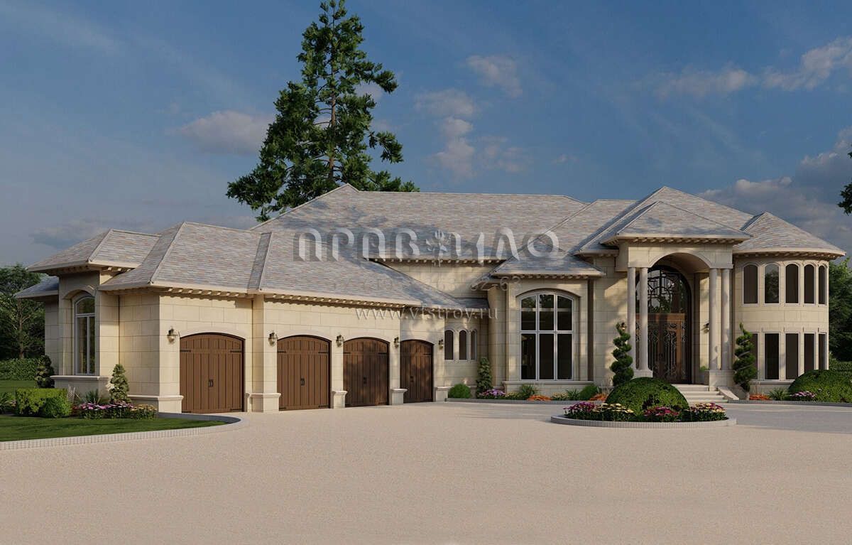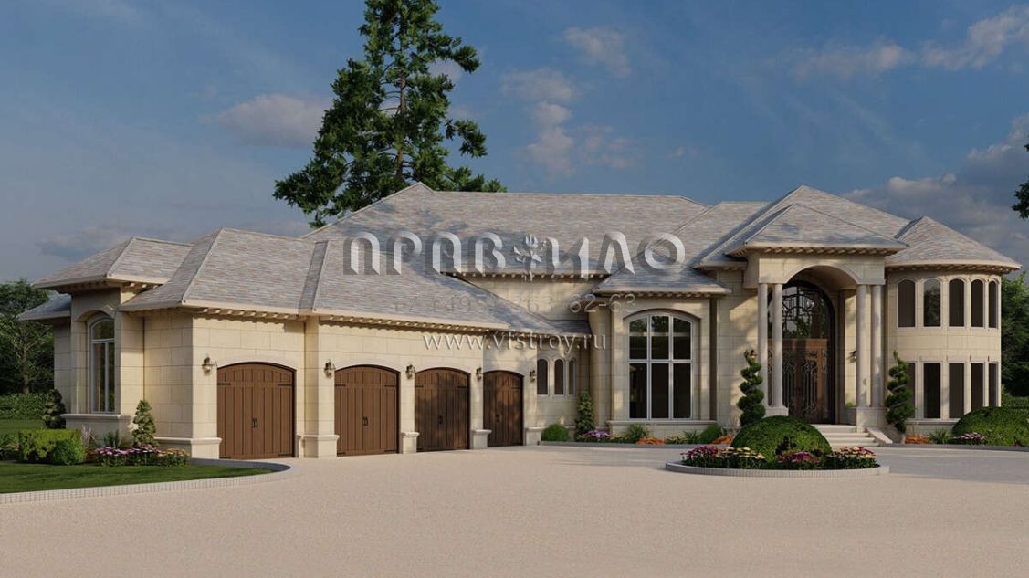 Это проект двухэтажного дома с гаражом на три и более машин жилой площадью 785 кв.м. Длина дома 47.2 м, ширина 36.9 м, высота 11 м. В доме шесть и более спален и шесть и более санузлов.