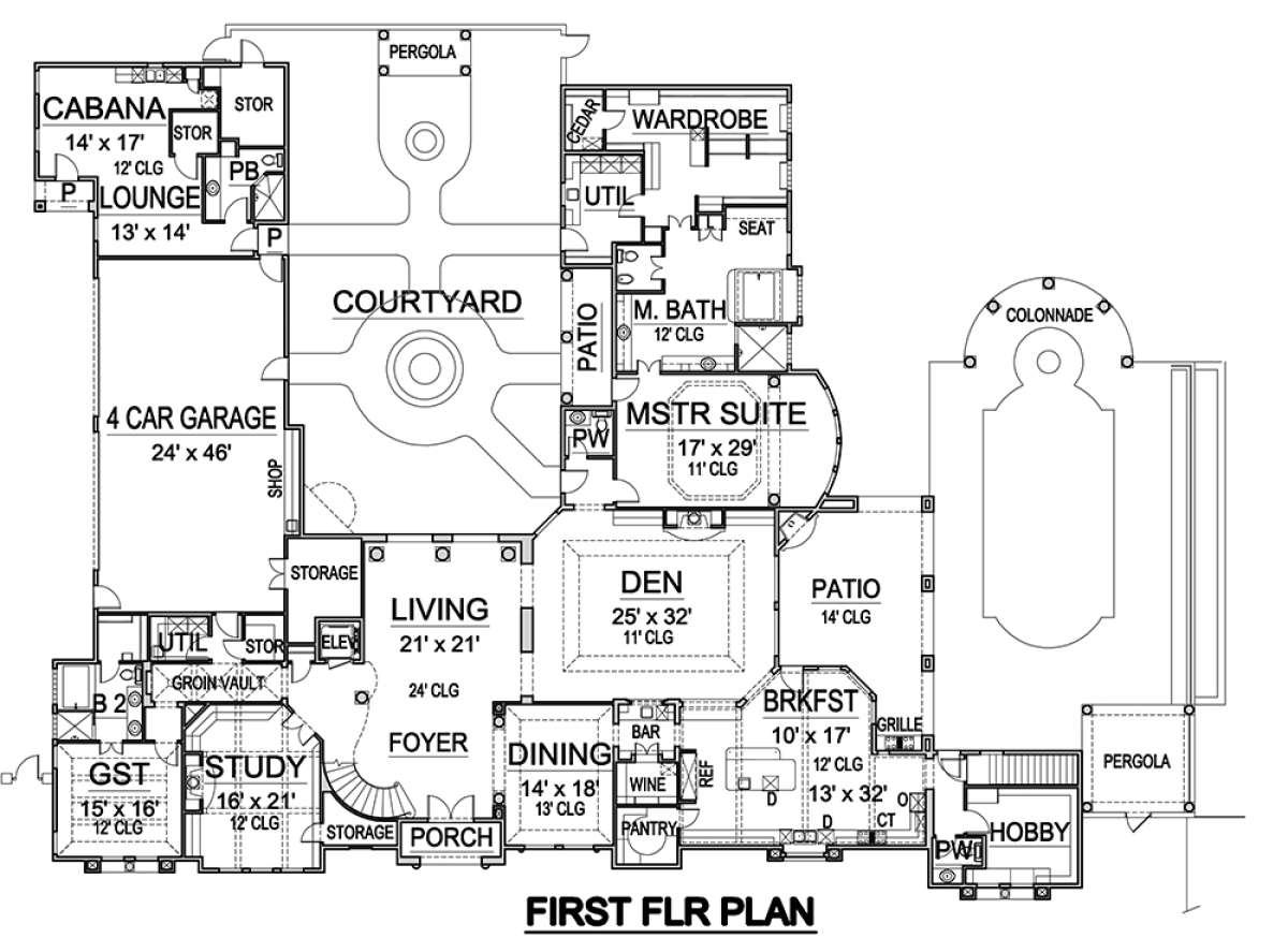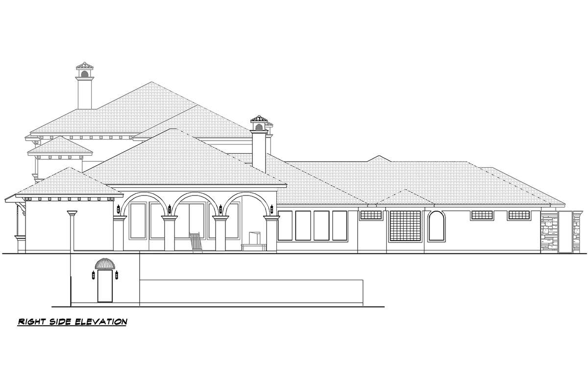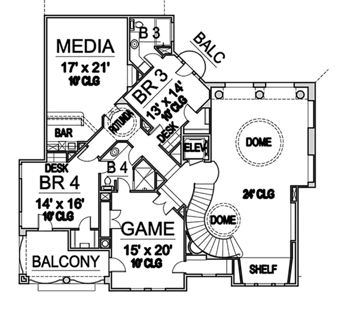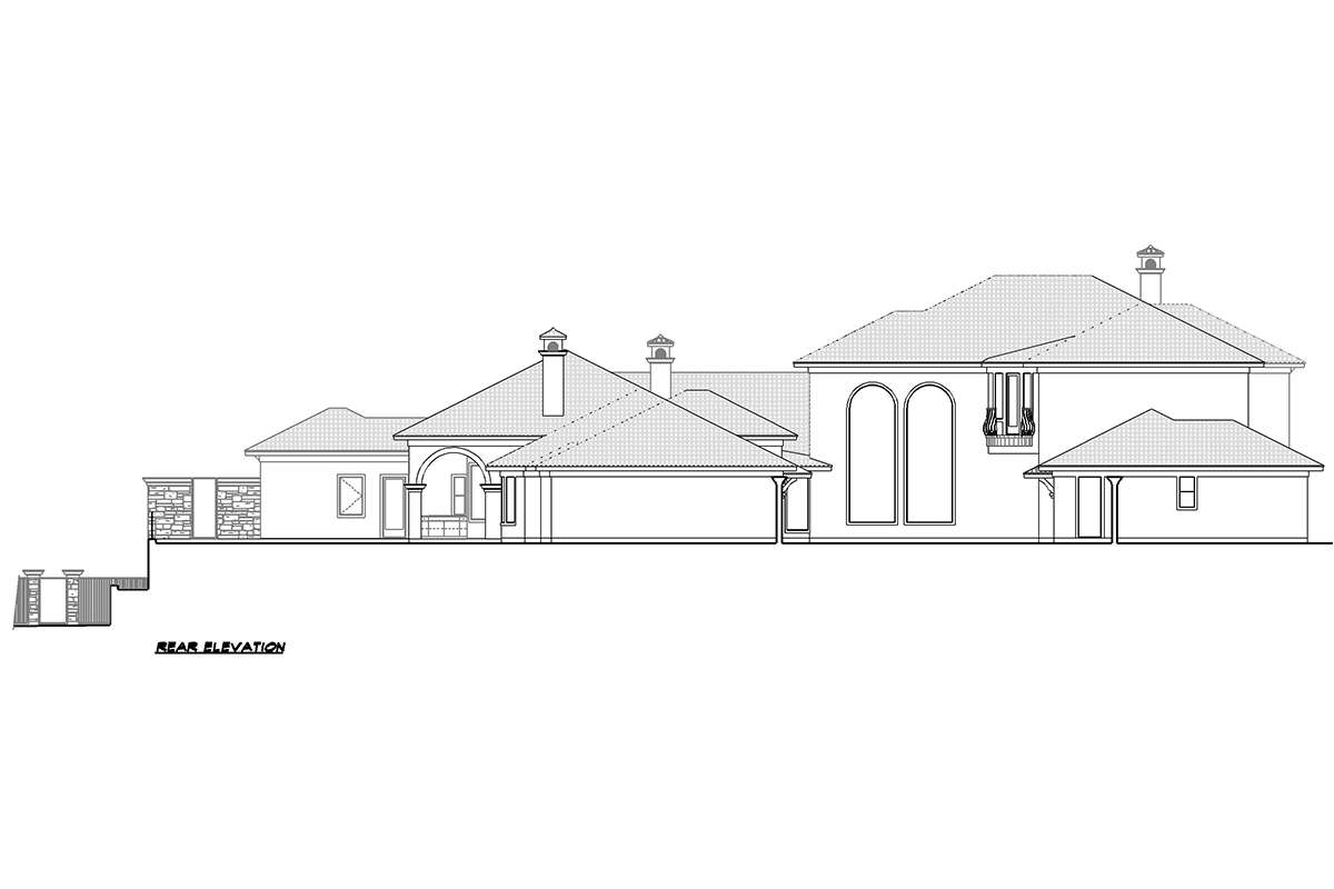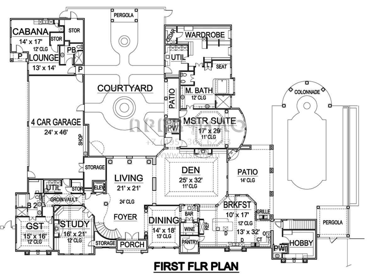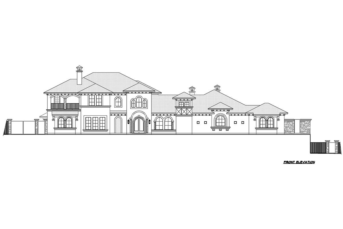 Это проект двухэтажного дома с гаражом на три и более машин жилой площадью 803 кв.м. Длина дома 33.2 м, ширина 41.8 м, высота 10.7 м. В доме четыре спальни и пять санузлов.