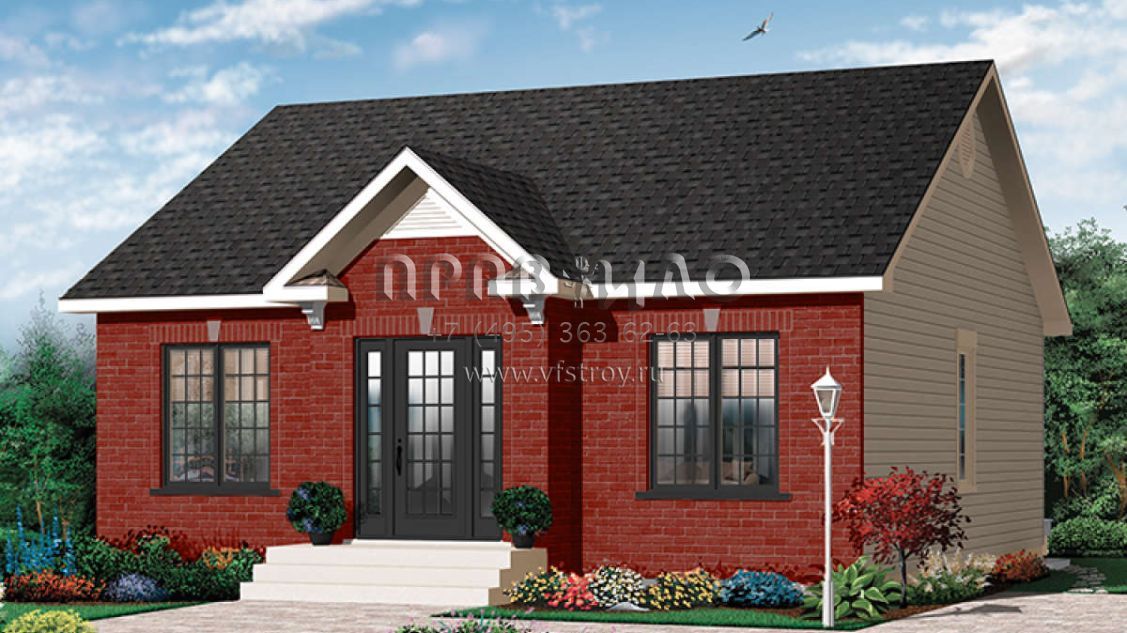 Это проект одноэтажного дома без гаража жилой площадью 82 кв.м. Длина дома 9.8 м, ширина 8.8 м, высота 5.8 м. В доме две спальни и один санузел.