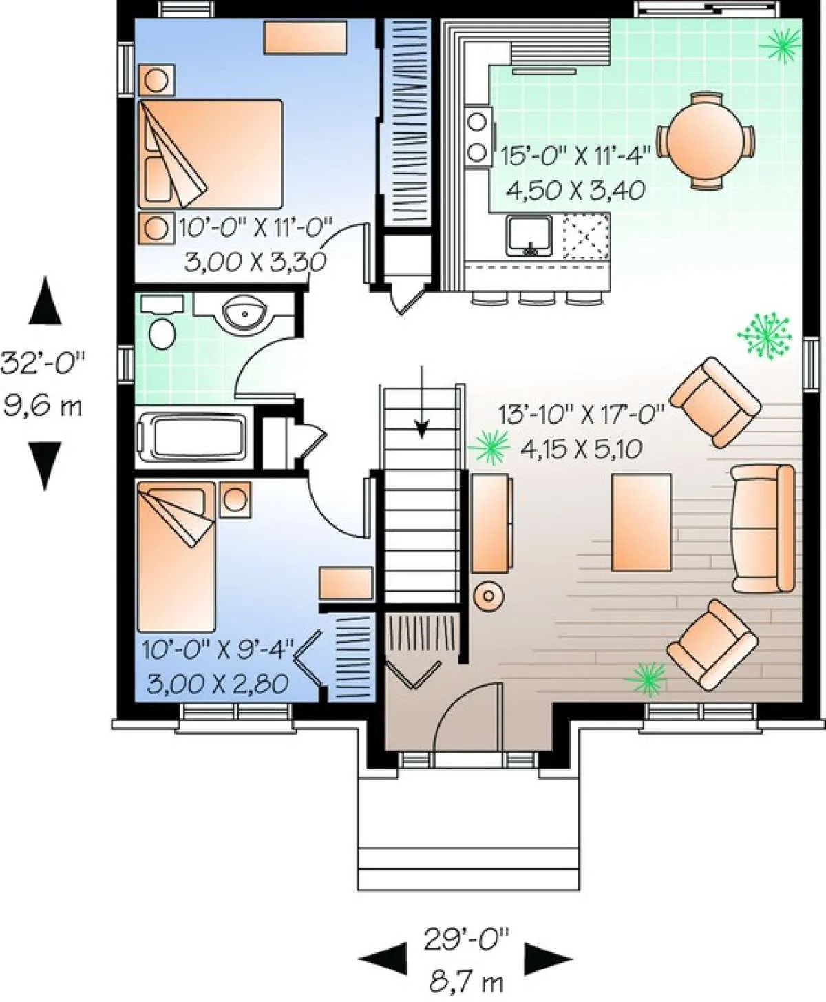 S5-82 (034-00620) Это иностранный проект, для которого требуется адаптация под нормы, действующие в Российской Федерации. Вы видите проект дома в английском стиле. В этом доме сочетаются черты сельской постройки и аскетичность лофта. Внутри жильцы смогут проводить время с максимальным комфортом. Обратим внимание, что сейчас на планировках все размеры представлены в футах. Для перевода в метры вам необходимо значение в футах умножить на 0,3048.