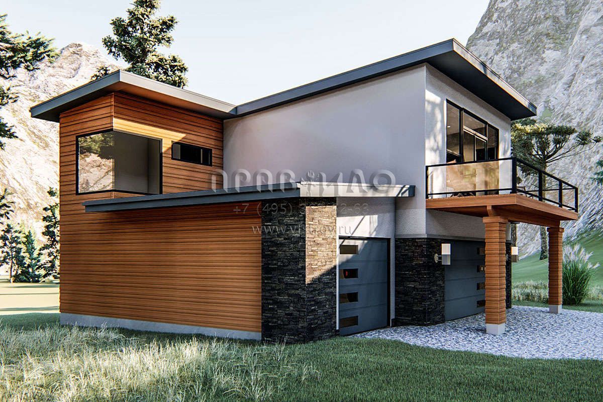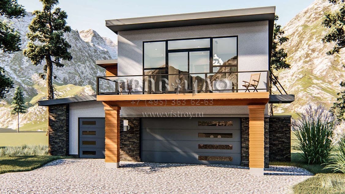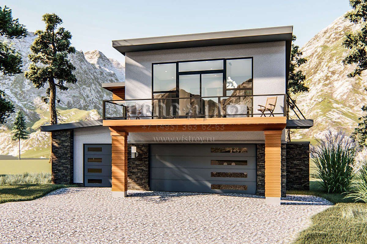 Это проект двухэтажного дома с гаражом на три и более машин жилой площадью 87 кв.м. Длина дома 12.2 м, ширина 14.3 м, высота 0 м. В доме одна спальня и один санузел.