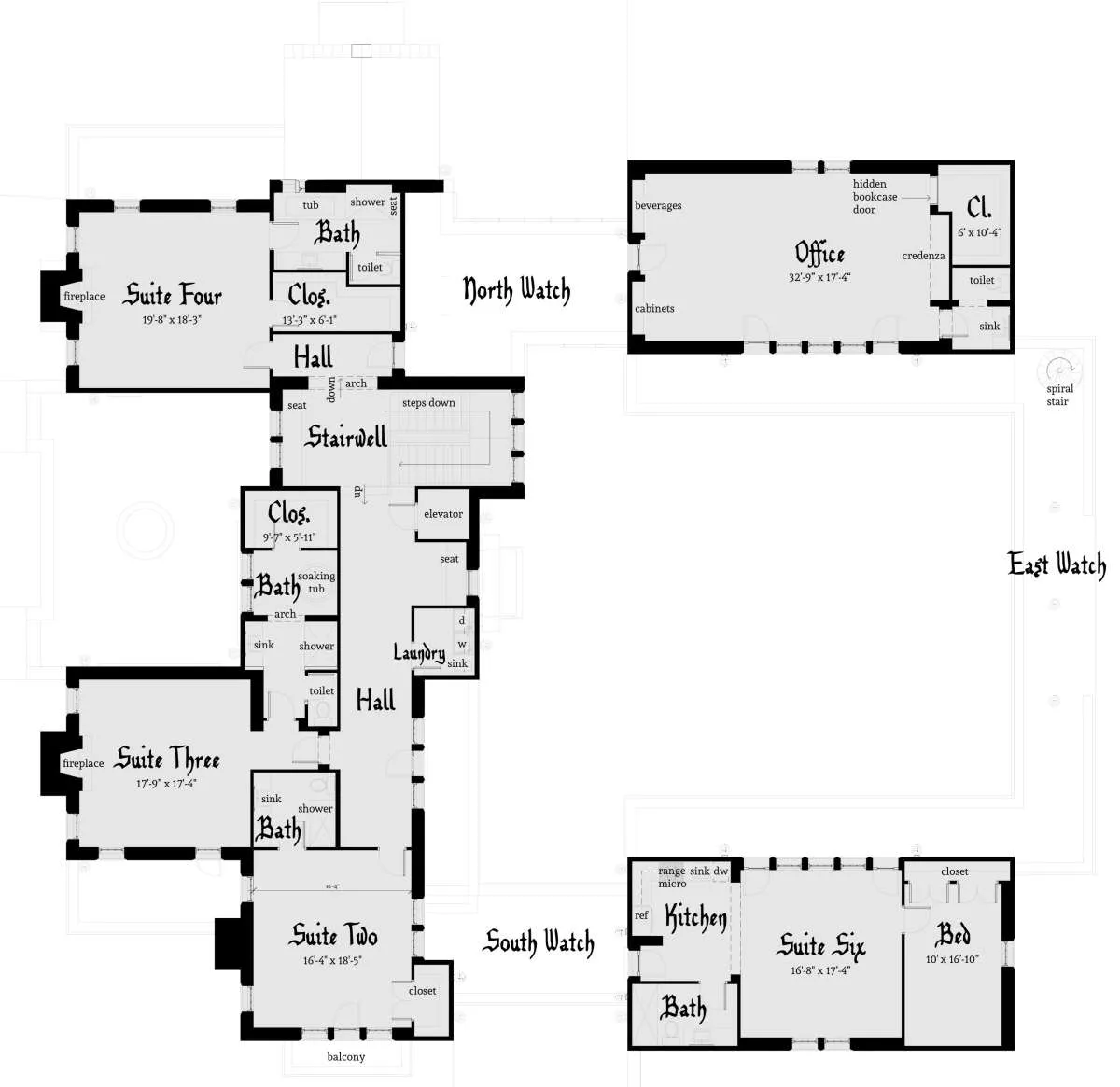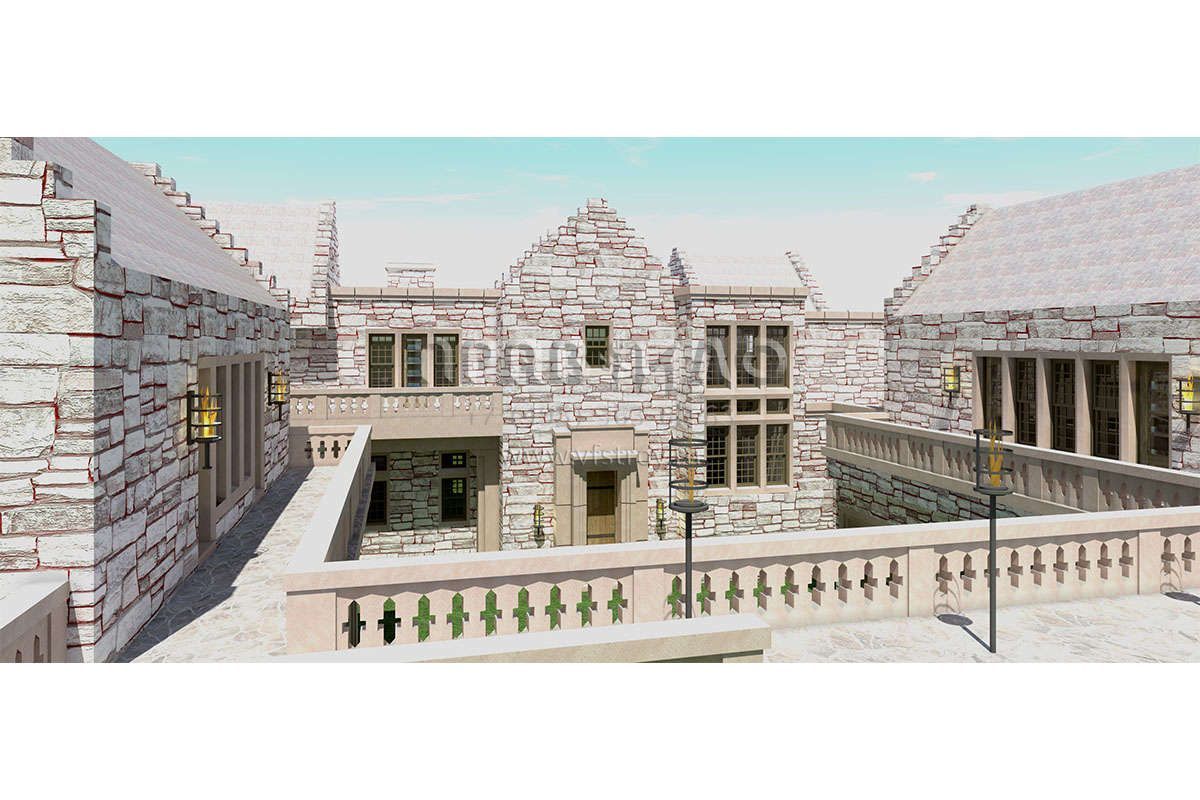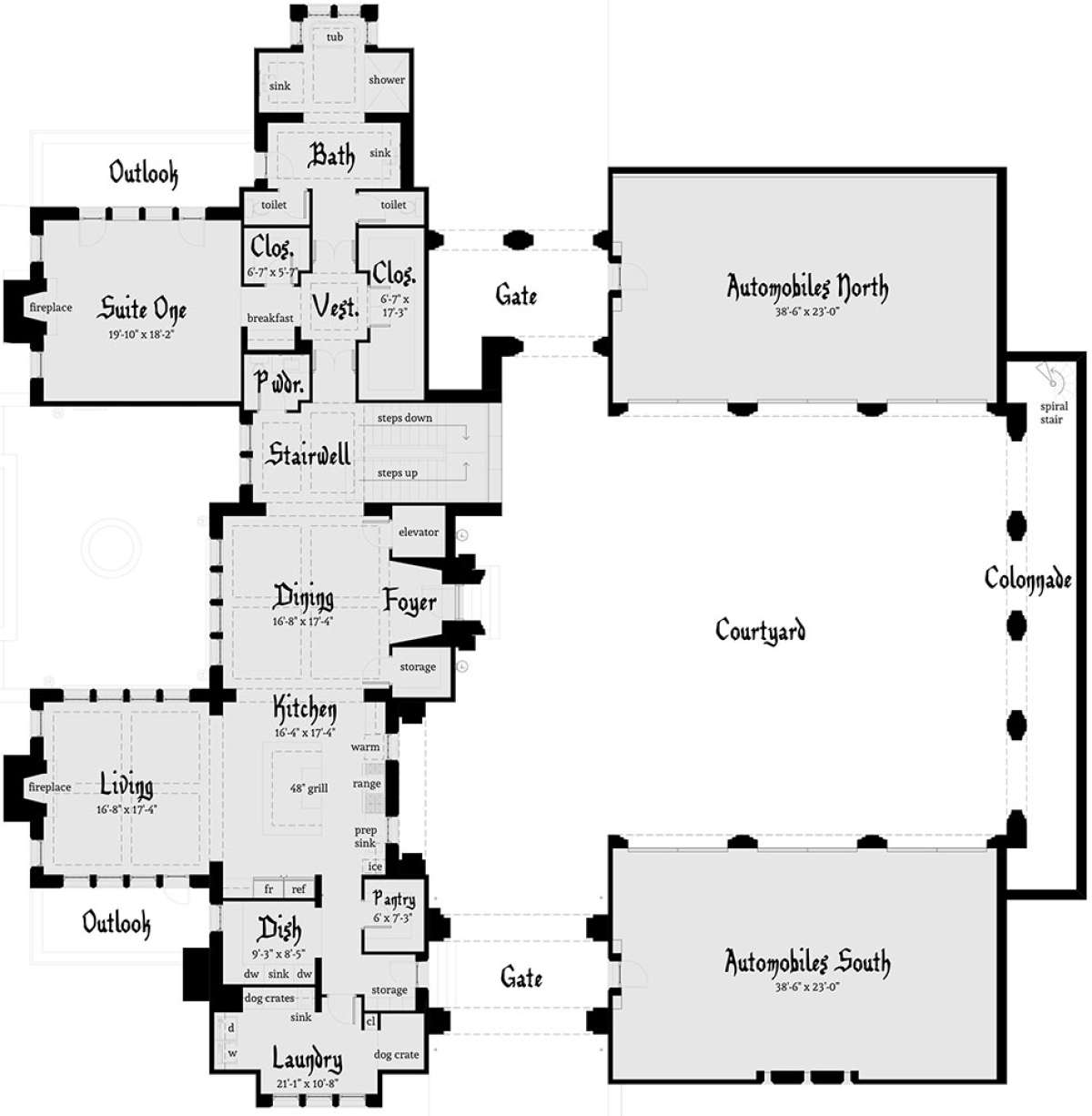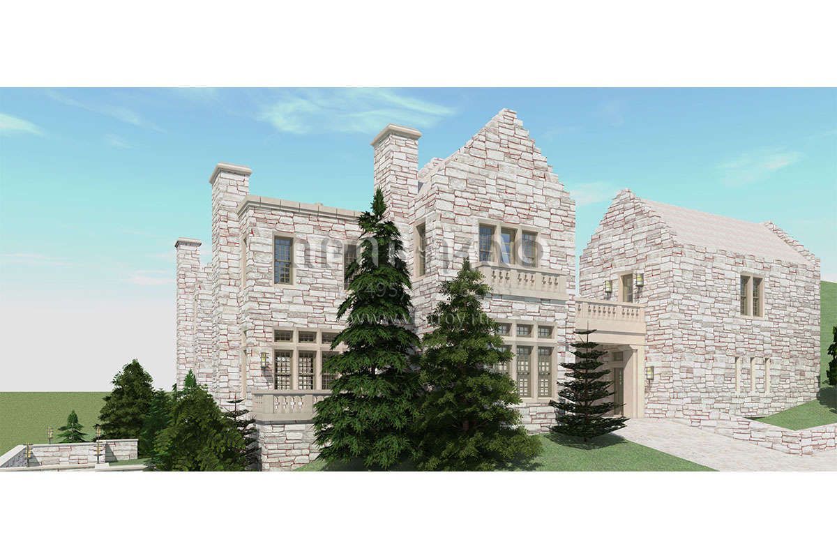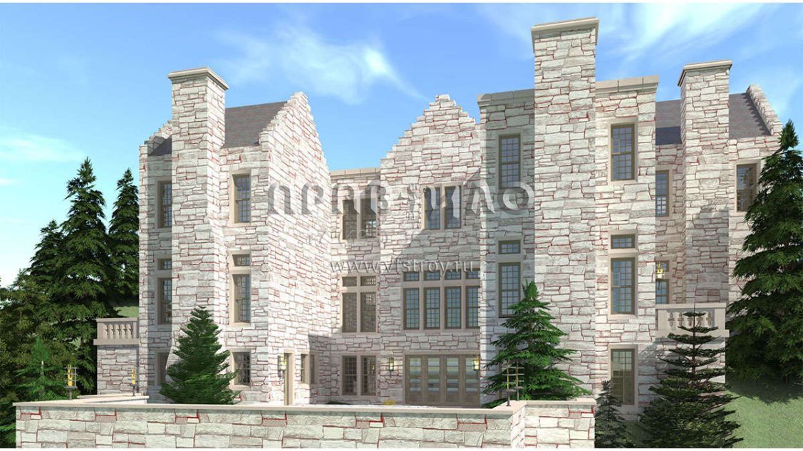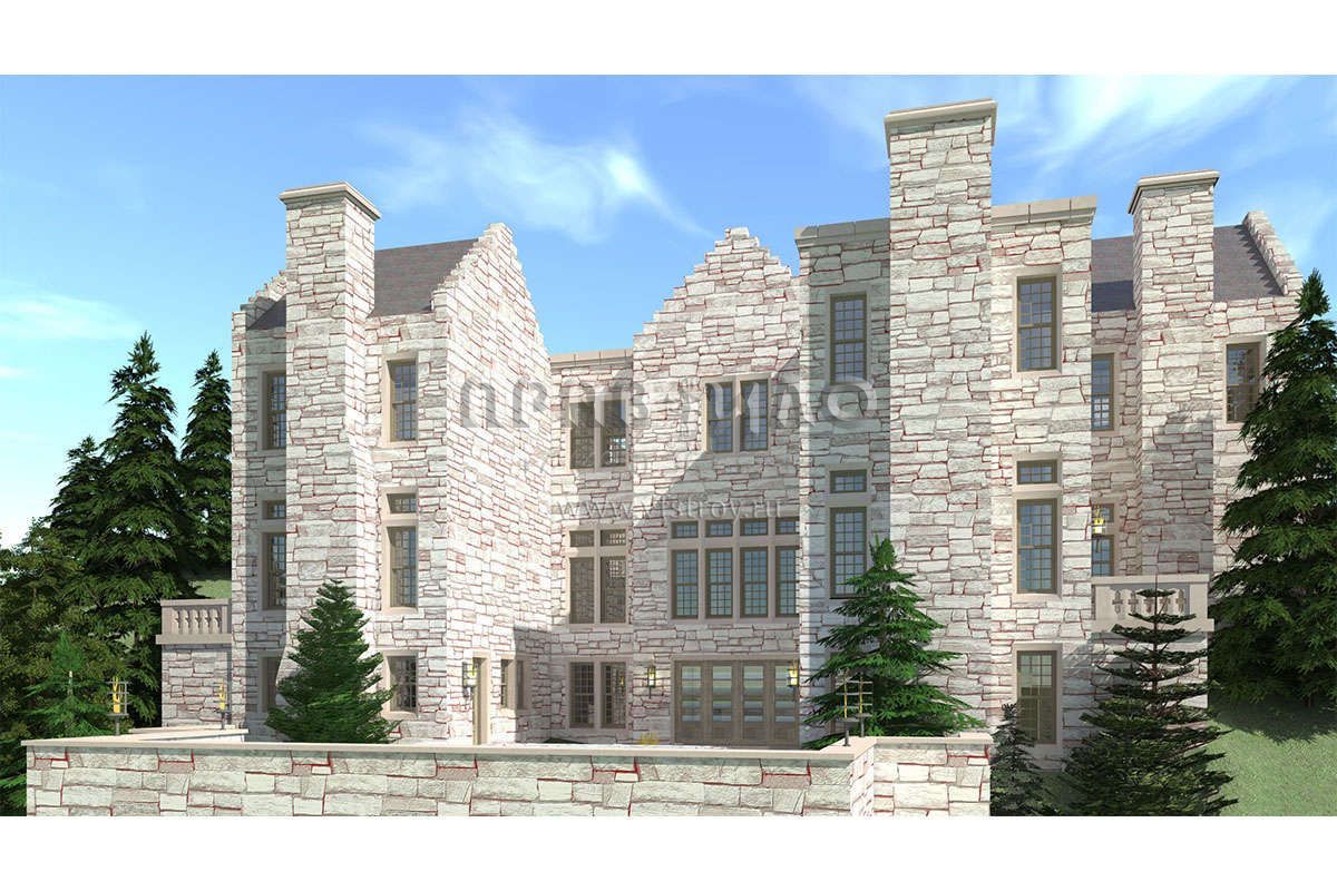 Это проект двухэтажного дома с гаражом на три и более машин жилой площадью 879 кв.м. Длина дома 33.8 м, ширина 33.2 м, высота 15.2 м. В доме шесть и более спален и шесть и более санузлов.