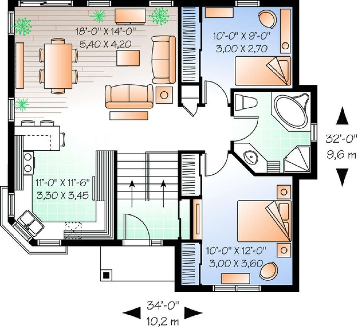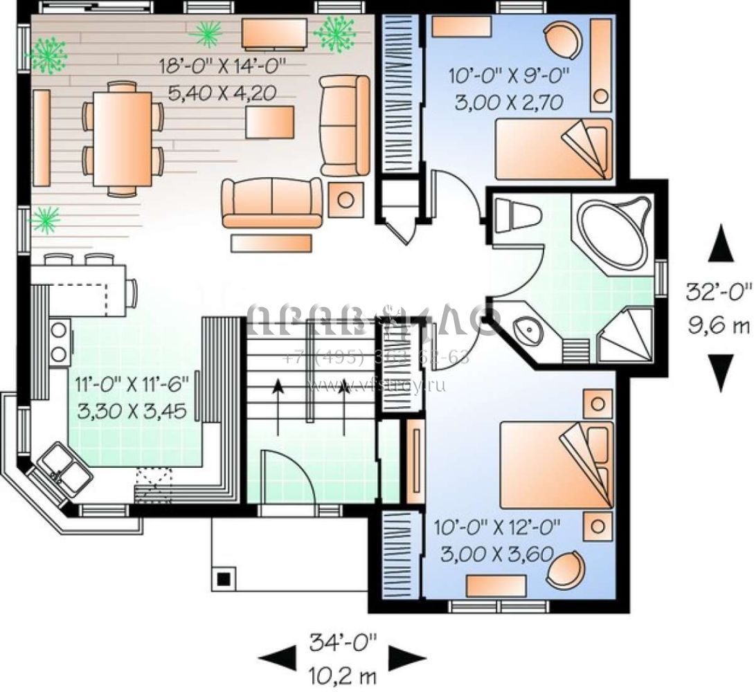 Это проект одноэтажного дома без гаража жилой площадью 88 кв.м. Длина дома 9.8 м, ширина 10.4 м, высота 7.6 м. В доме две спальни и один санузел.