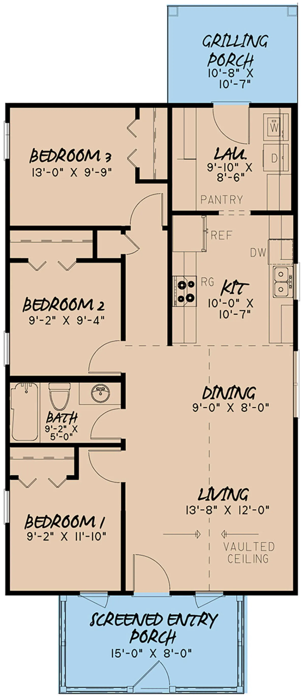 Это проект одноэтажного дома без гаража жилой площадью 90 кв.м. Длина дома 17.1 м, ширина 7.3 м, высота 0 м. В доме три спальни и один санузел.