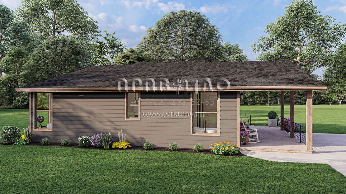 Это проект одноэтажного дома без гаража жилой площадью 93 кв.м. Длина дома 10.4 м, ширина 14 м, высота 4.9 м. В доме одна спальня и один санузел.