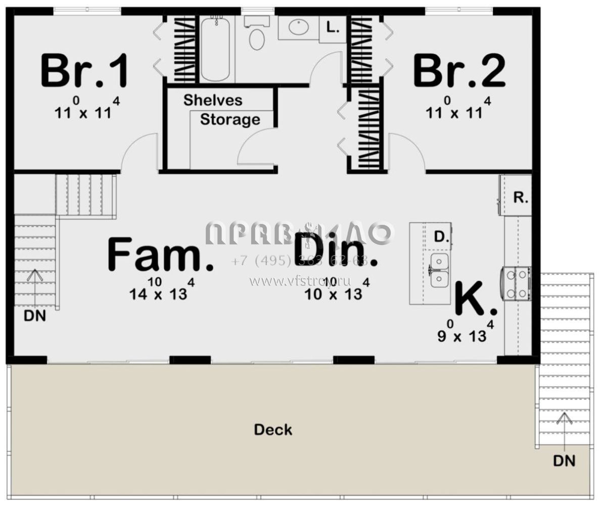 S5-94 (963-00419) Это иностранный проект, для которого требуется адаптация под нормы, действующие в Российской Федерации. Вы видите проект дома в стиле Ранчо. В этом доме сочетаются черты сельской постройки и аскетичность лофта. Внутри жильцы смогут проводить время с максимальным комфортом. Обратим внимание, что сейчас на планировках все размеры представлены в футах. Для перевода в метры вам необходимо значение в футах умножить на 0,3048.