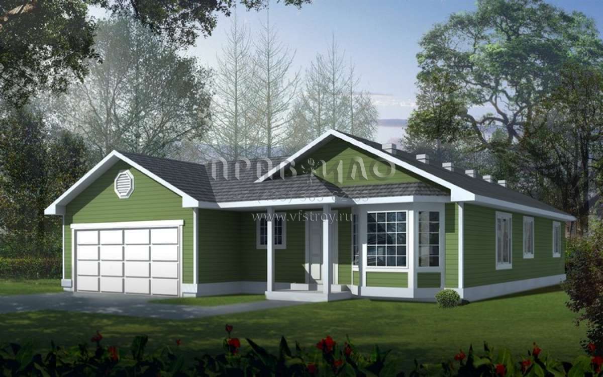 Это проект одноэтажного дома с гаражом на две машины жилой площадью 95 кв.м. Длина дома 14.9 м, ширина 13.1 м, высота 4.6 м. В доме три спальни и два санузла.