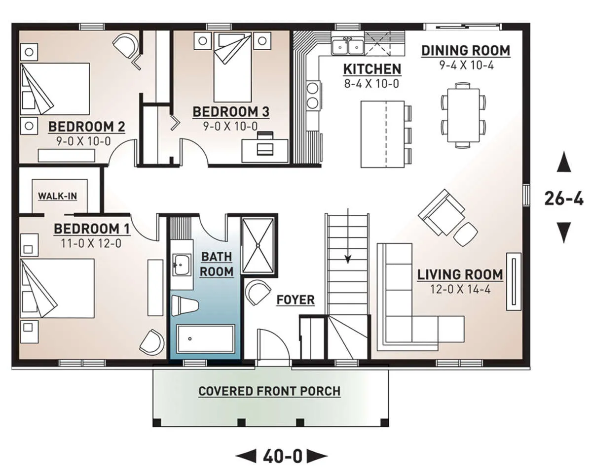 Это проект одноэтажного дома без гаража жилой площадью 98 кв.м. Длина дома 7.9 м, ширина 12.2 м, высота 5.8 м. В доме три спальни и один санузел.