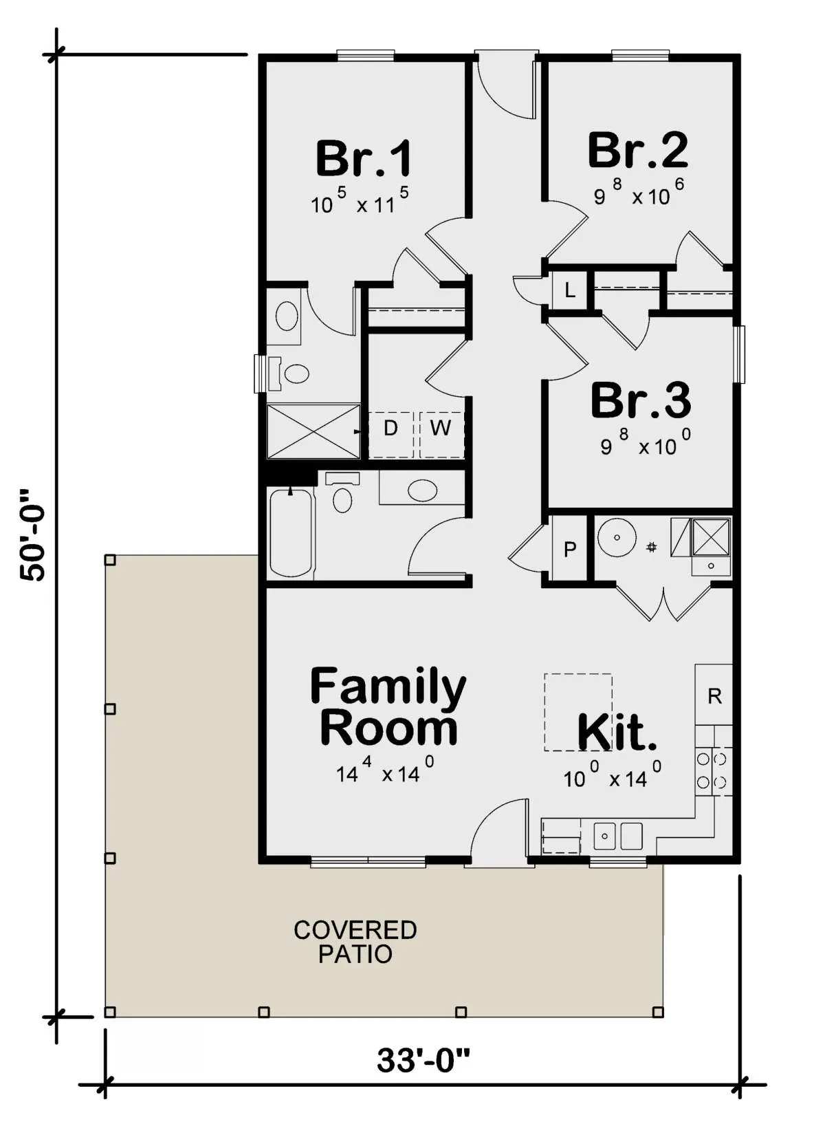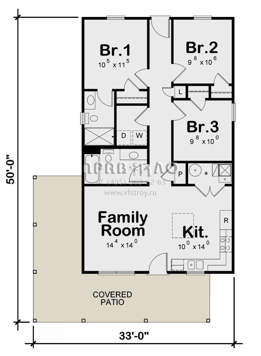 Это проект одноэтажного дома без гаража жилой площадью 98 кв.м. Длина дома 15.2 м, ширина 10.1 м, высота 4.9 м. В доме три спальни и два санузла.