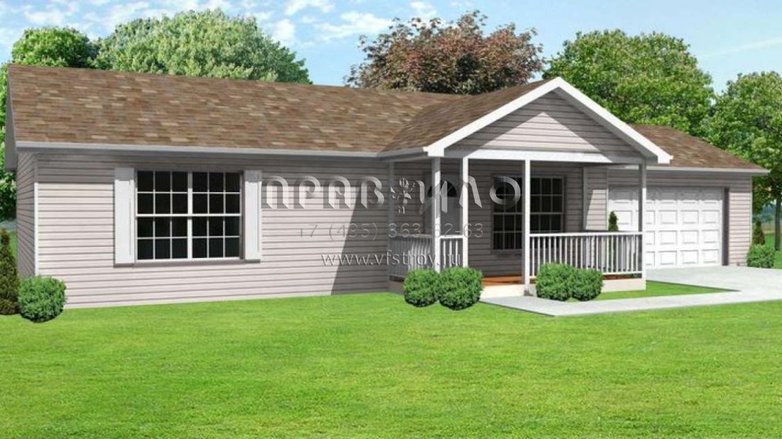 Это проект одноэтажного дома с гаражом на две машины жилой площадью 99 кв.м. Длина дома 8.5 м, ширина 18.3 м, высота 4.6 м. В доме три спальни и один санузел.