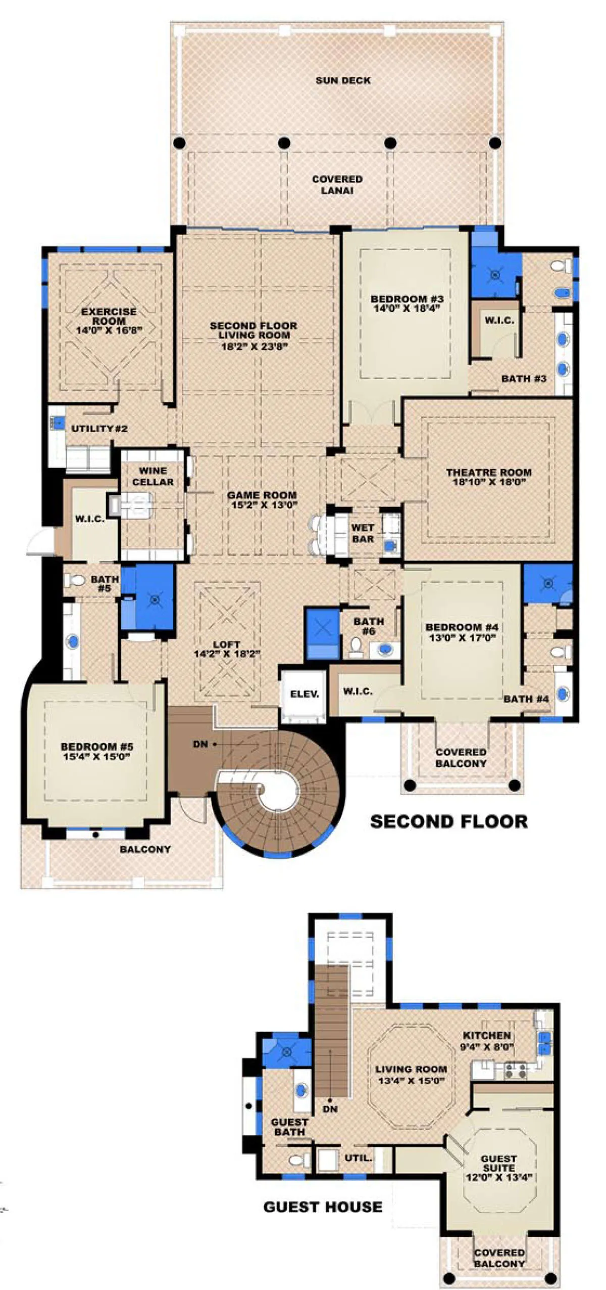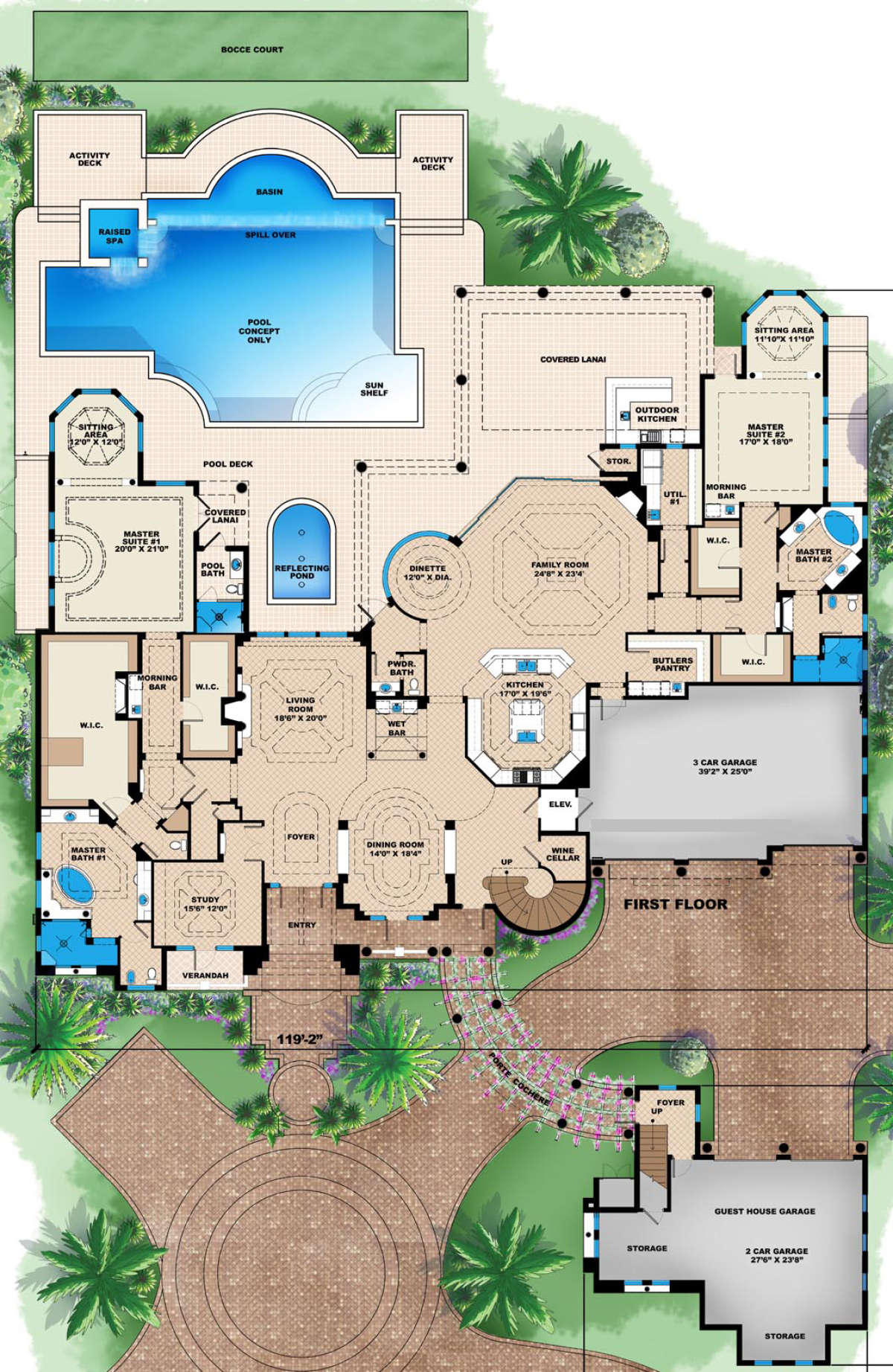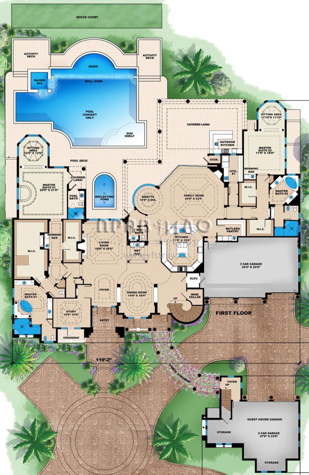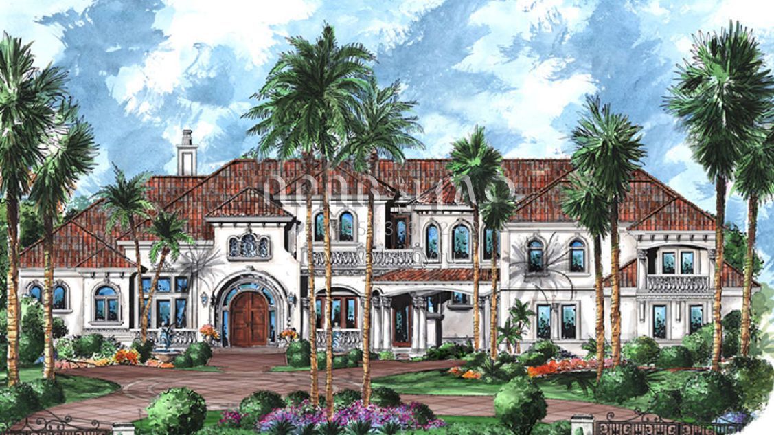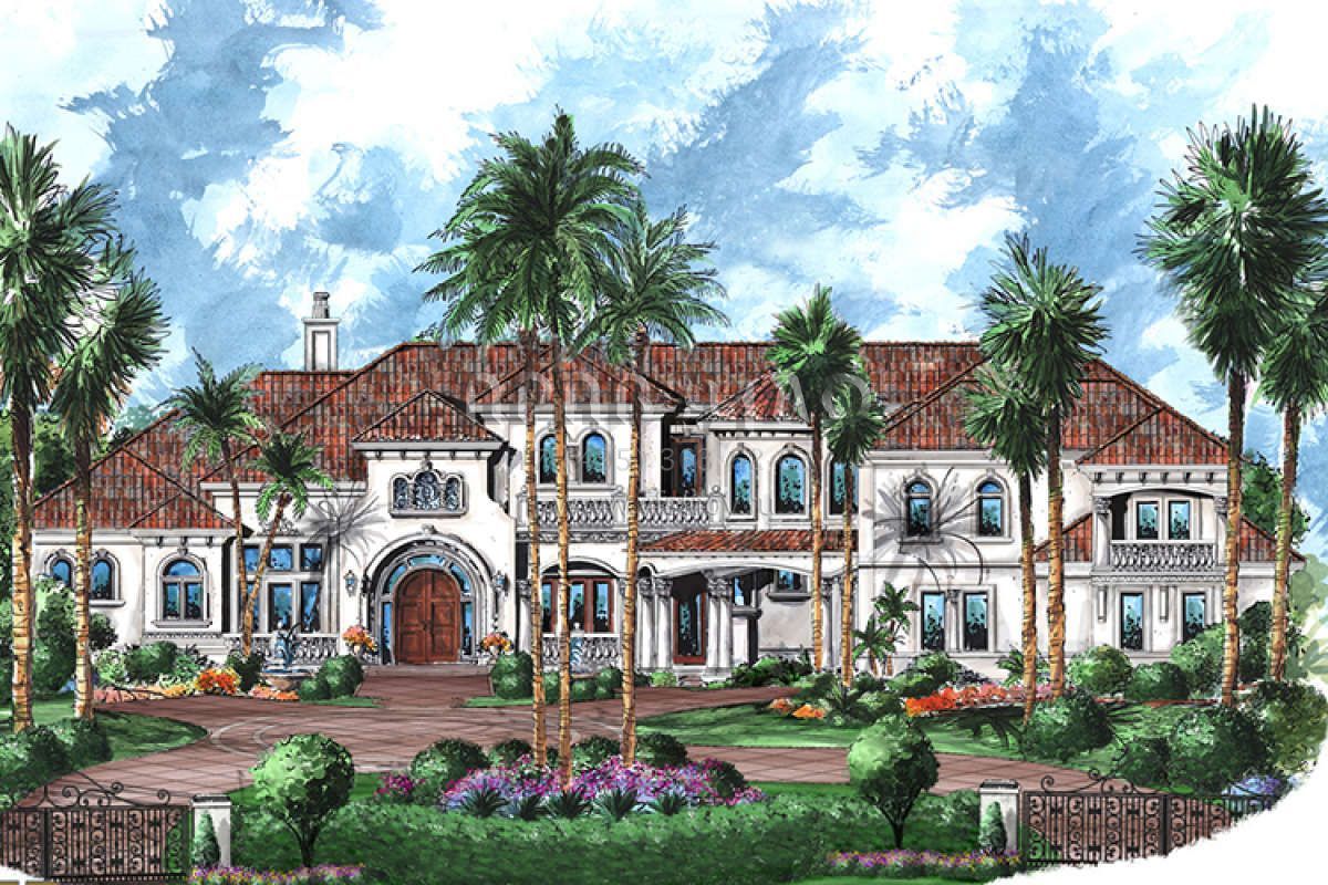 Это проект двухэтажного дома с гаражом на три и более машин жилой площадью 990 кв.м. Длина дома 46.9 м, ширина 36.3 м, высота 9.1 м. В доме шесть и более спален и .
