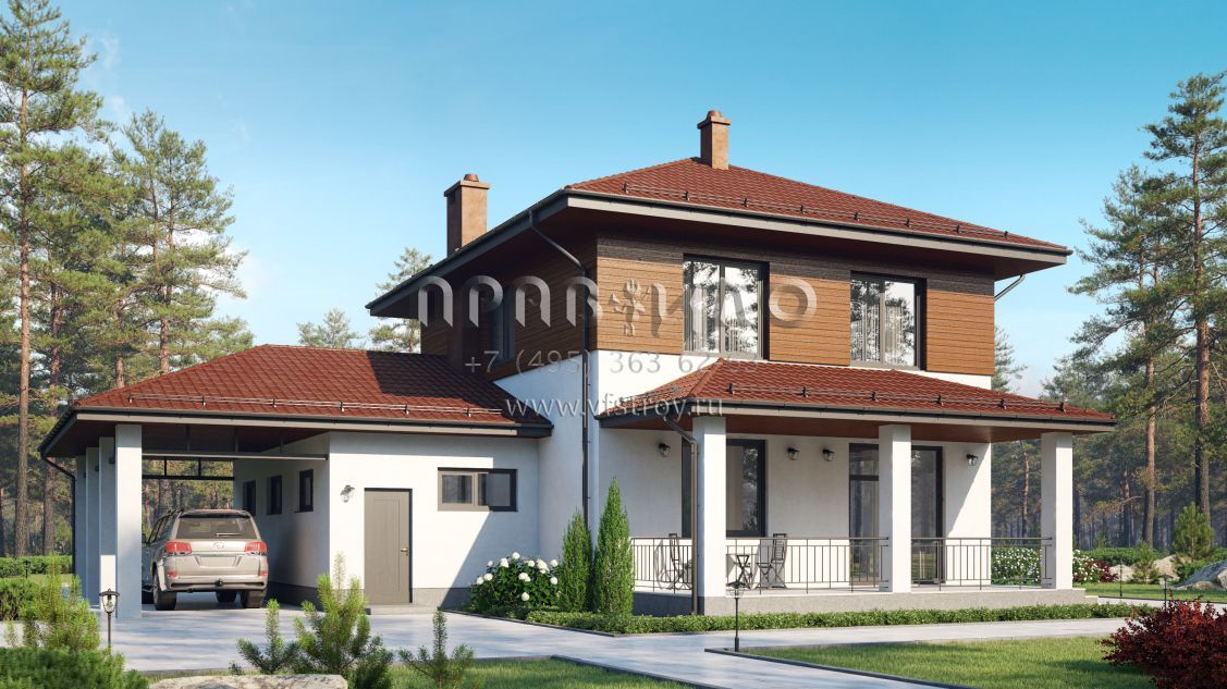 Двухэтажный дом из газобетона с гаражом, навесом и террасой S7-181 (3-46d)