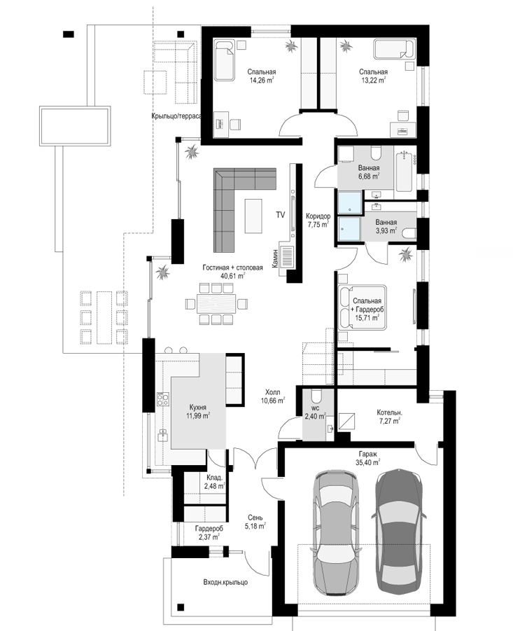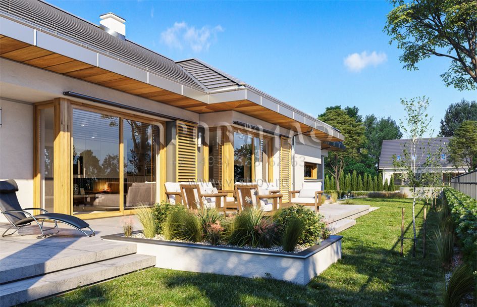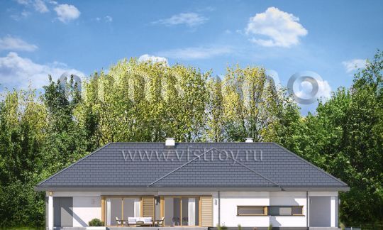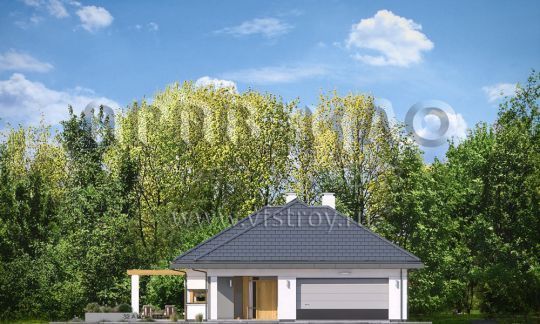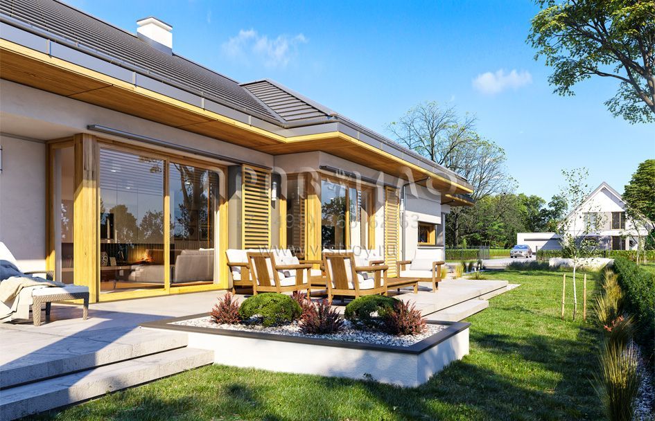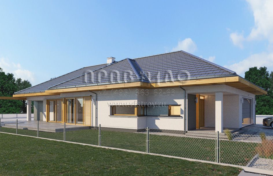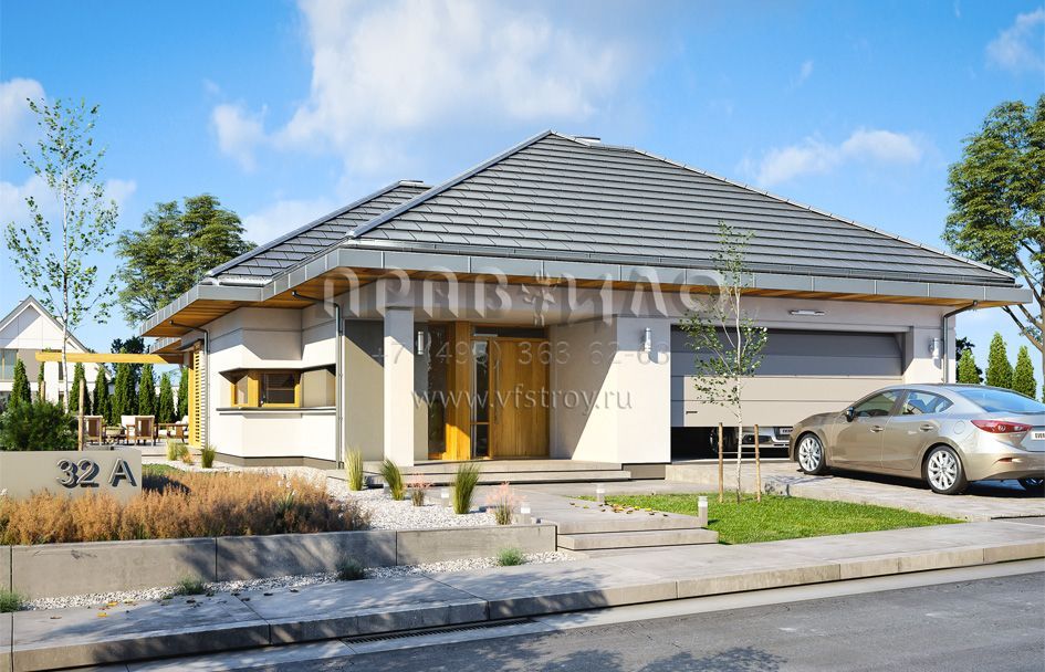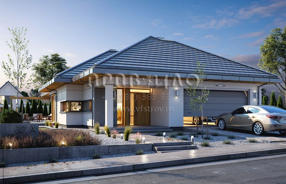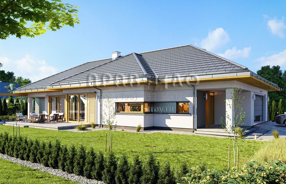 Проект современного одноэтажного вытянутого в длину дома с гаражом на два автомобиля S8-223-1 (Узкий)