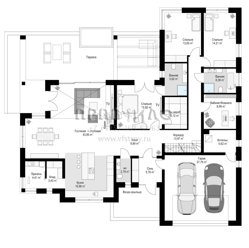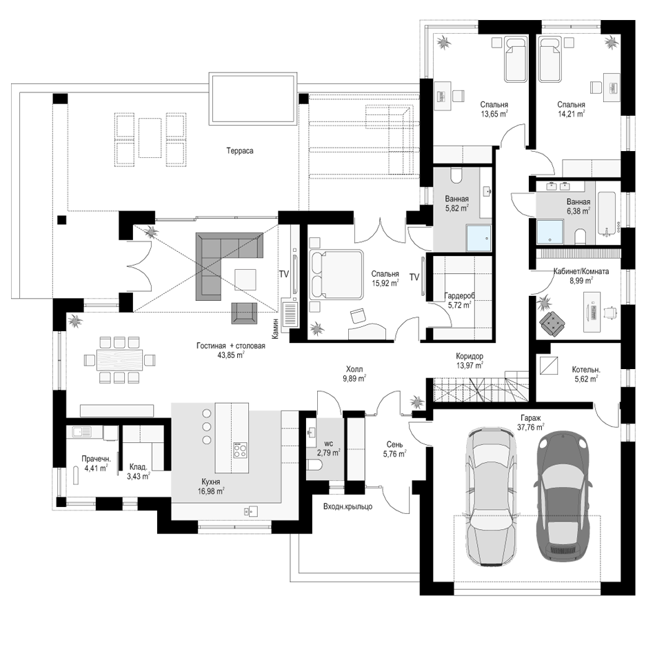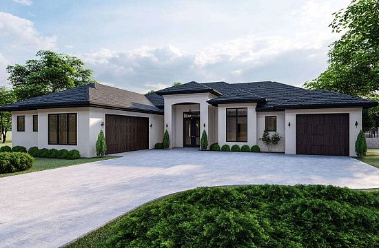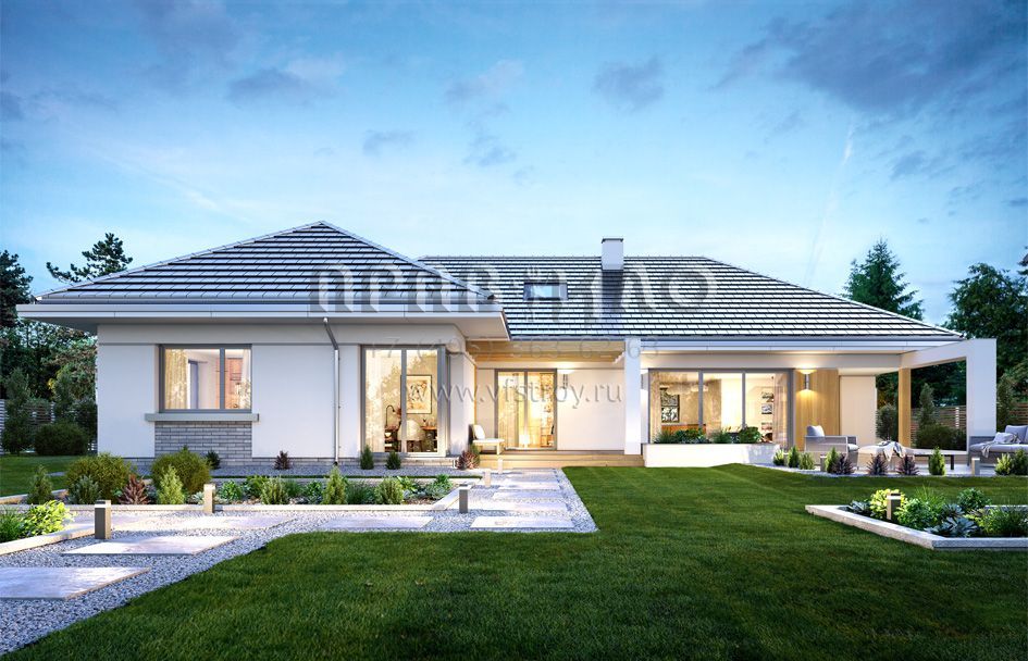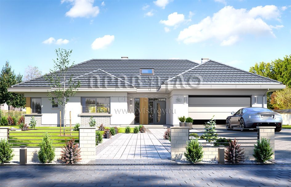 Проект одноэтажного дома с большой террасой и гаражом на два автомобиля S8-280-3 (Одноэтажная Вилла)