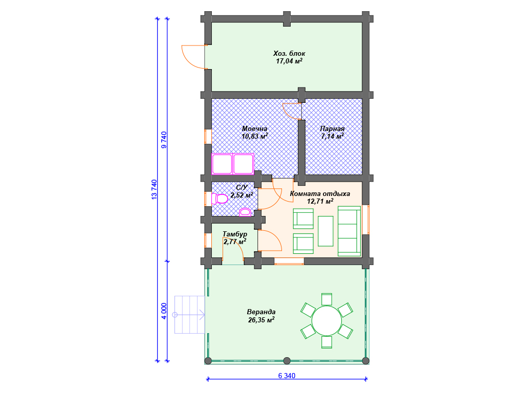 Проект деревянной бани для узкого участка SB4-79 (Б-020)