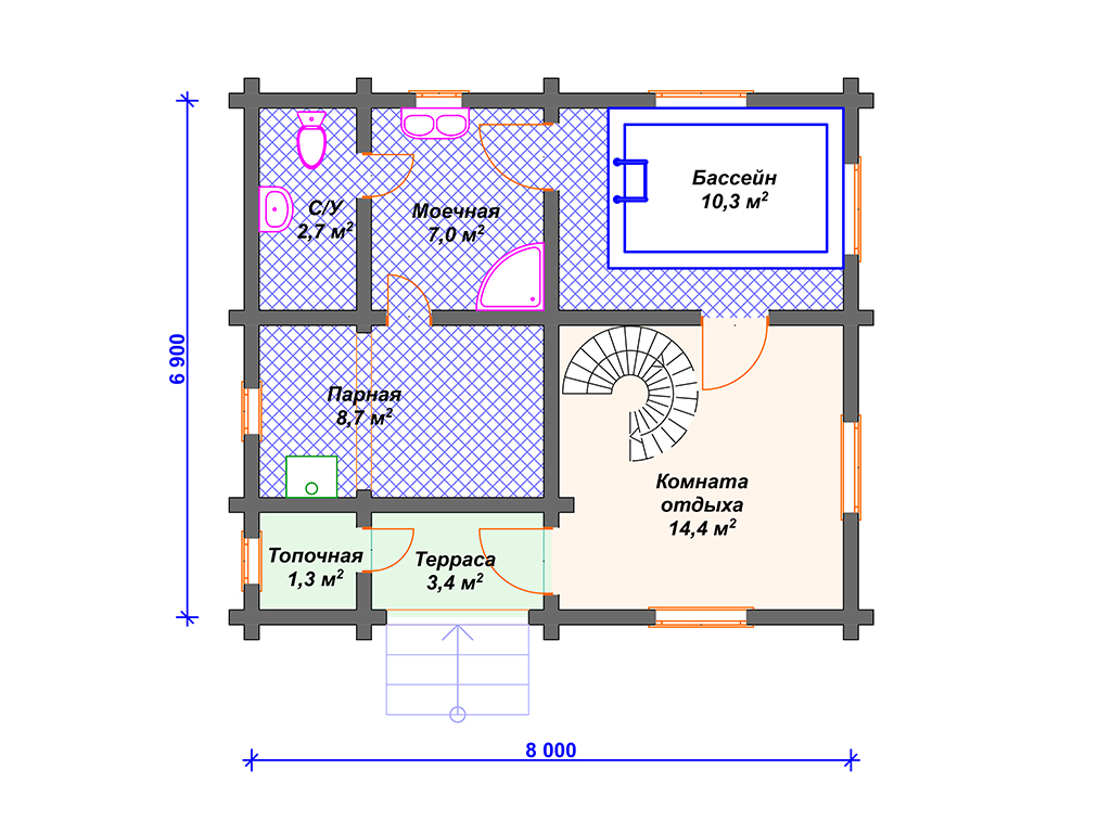 Проект деревянной бани с бассейном SB4-95 (Б-003)