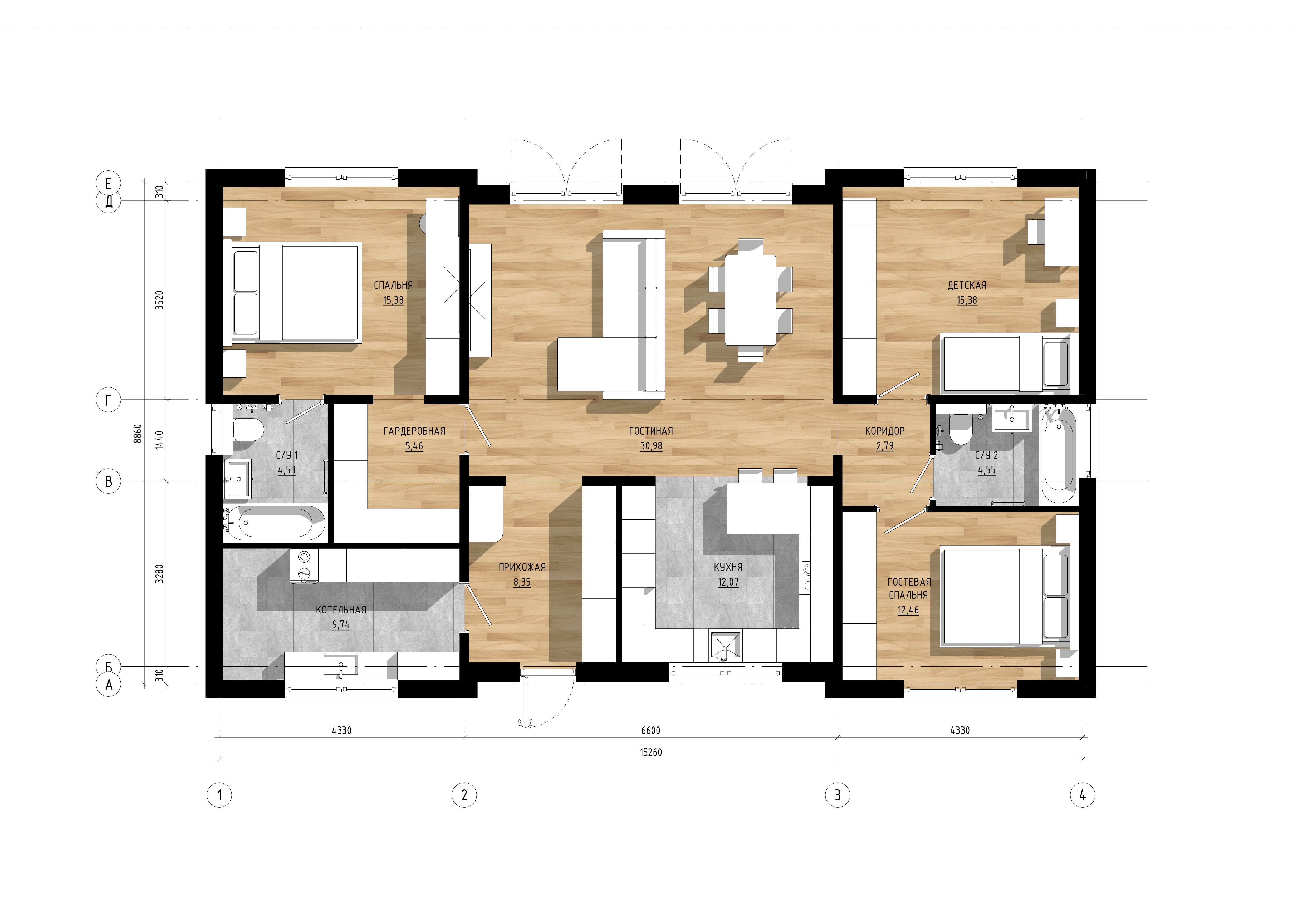 Проект дома из двухслойных ж/б панелей с тремя спальнями SP2-120-1 (1А-120-1СК)