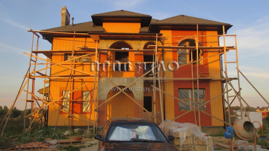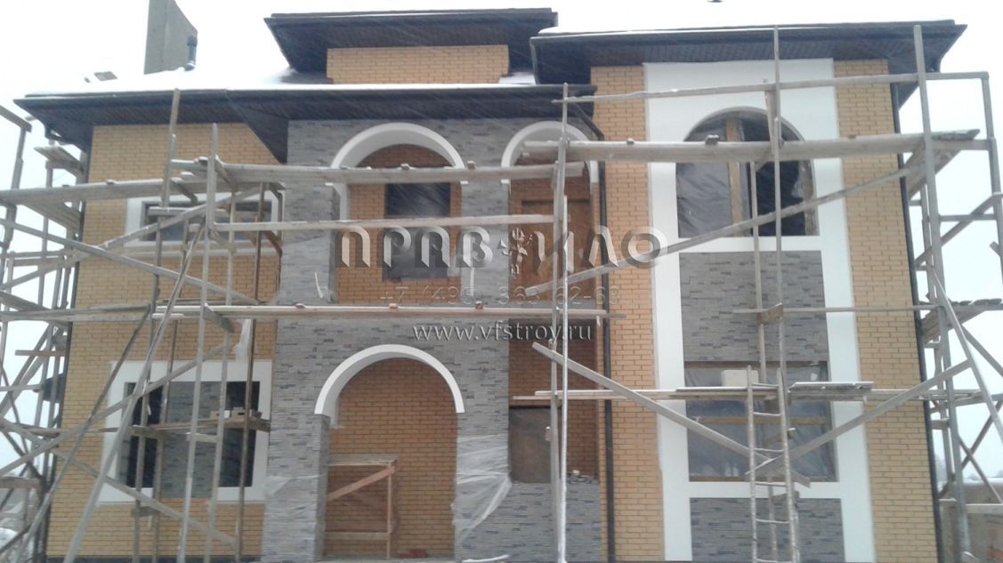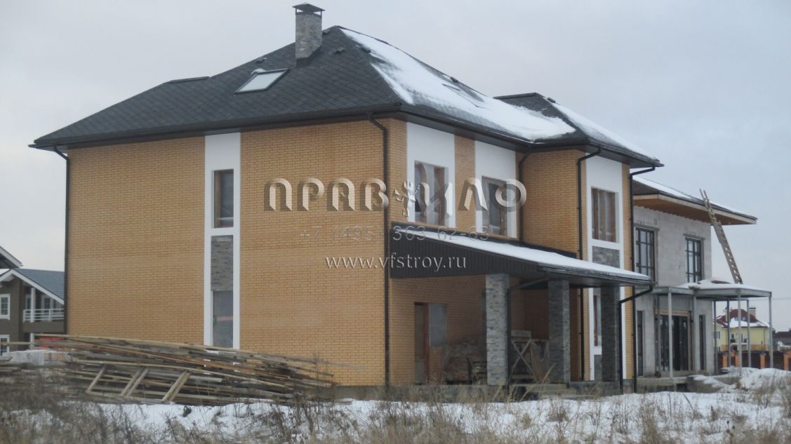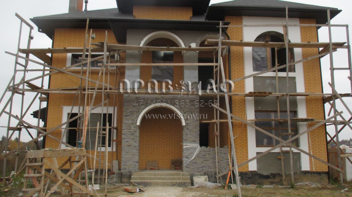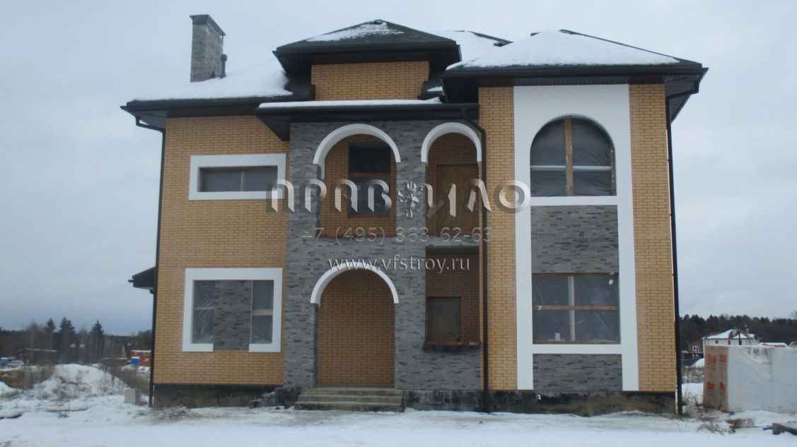 Строительство ведется в Наро-Фоминском районе Московской области, близ д. Мартемьяново. В представленном здесь проекте можно говорить об интересном стилистическом миксе: автору удалось объединить классический особняк и рыцарский замок. Несомненно, главную роль сыграло оформление фасада грубым рустовым камнем. Для довершения образа использован центральный эркер с кровлей, украшенной шпилем: сходство со смотровой башенкой налицо. Что же касается элементов классического стиля – как не заметить арочные окна, украшающие главный фасад этого дома.С ними рифмуется арка, которой оформлен центральный вход. Проектом дома предусмотрено три этажа, причем третий – мансардный. На первом этаже расположена гостевая группа, представленная гостиной с камином, столовой и пристроенным помещением – террасой с собственным выходом во двор.