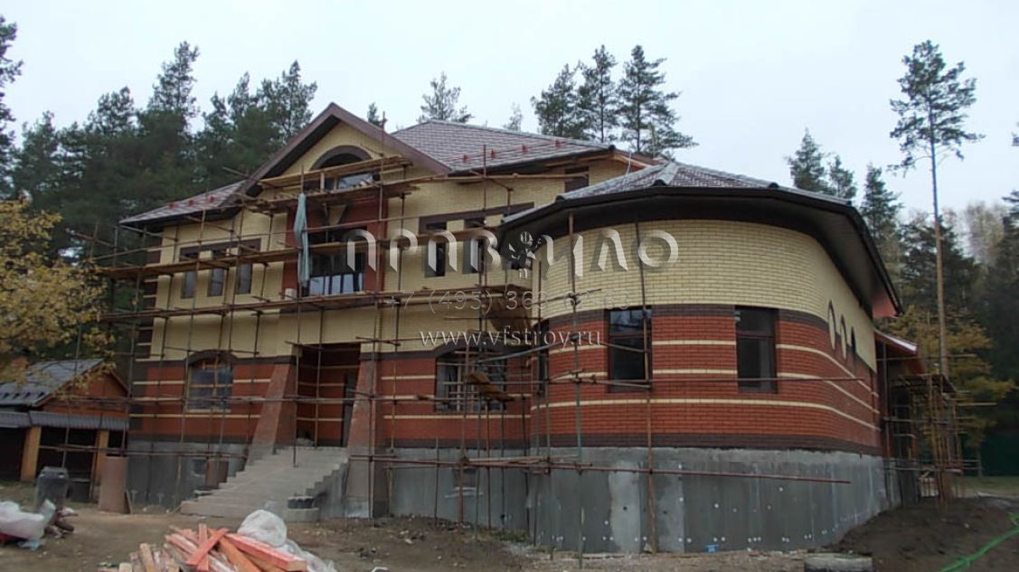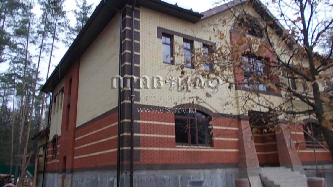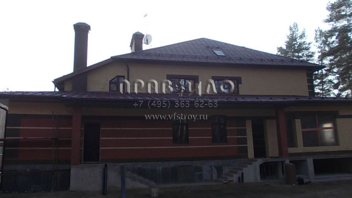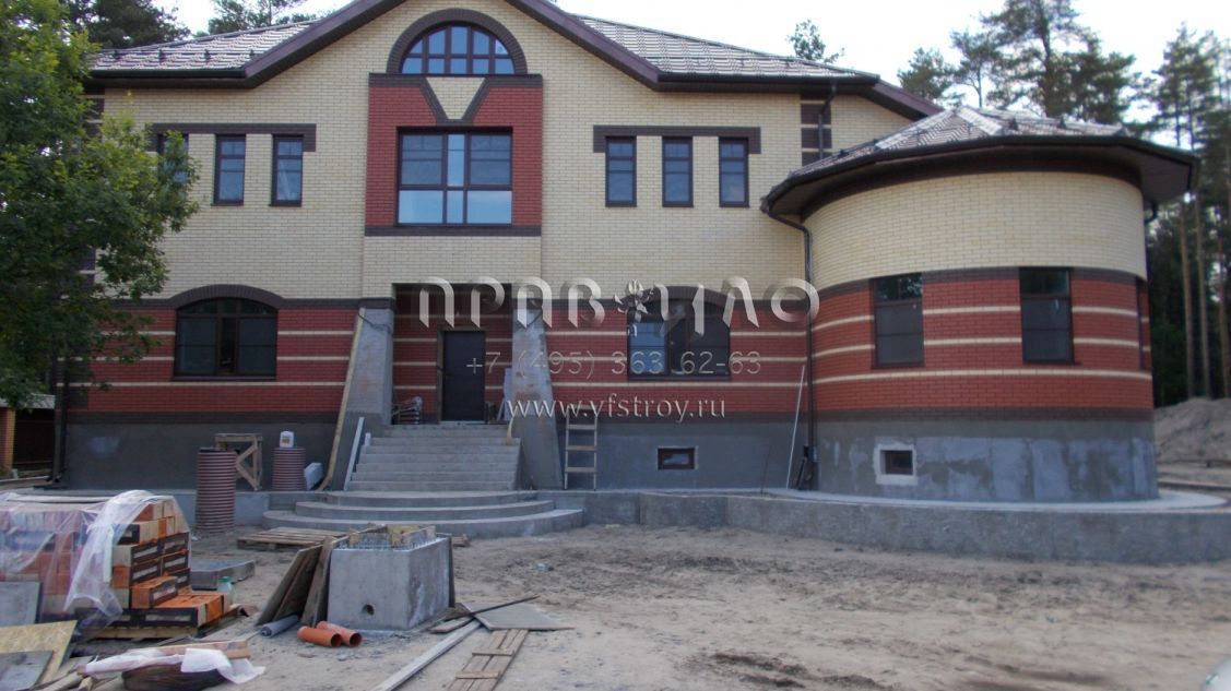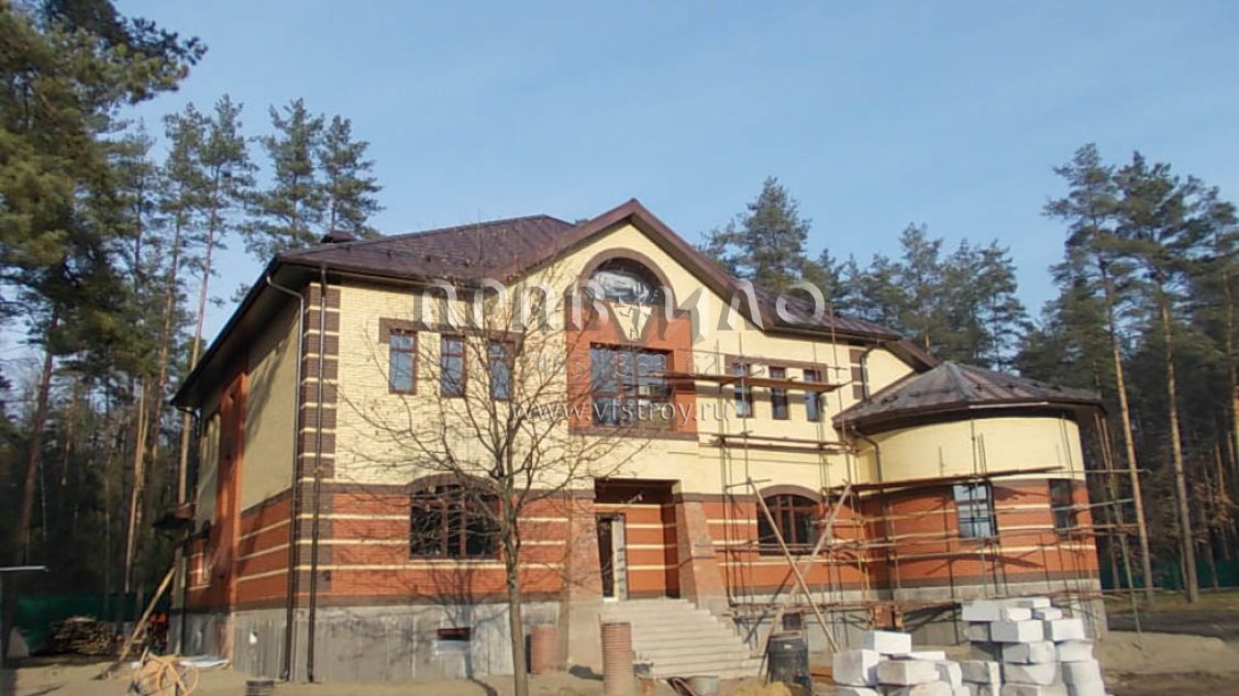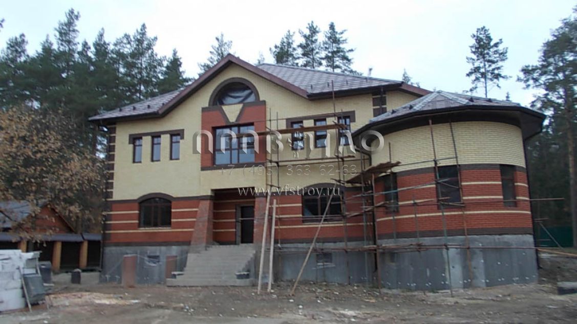 Строительство загородного дома ведется в Раменском районе, вблизи д. Литвиново. Проект загородного особняка с простыми в архитектурном плане, но крепко сбитыми фасадами и ярко выраженным входным порталом. В результате дом смотрится крепким и надежным. В нем имеется просторный цокольный этаж, куда вынесены практически все вспомогательные бытовые и технические помещения. Нашлось место и для установки бильярдного стола. Несомненное достоинство – релаксационный комплекс с большим бассейном. Обязательно стоит выделить и наличие в уровне первого этажа небольшой изолированной квартиры для обслуживающего персонала. На втором этаже расположены три просторные спальни и большая ванная комната.