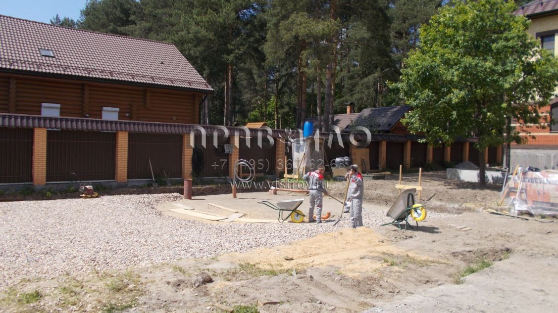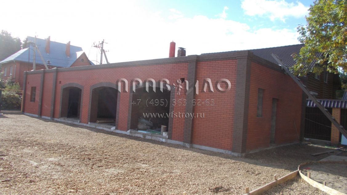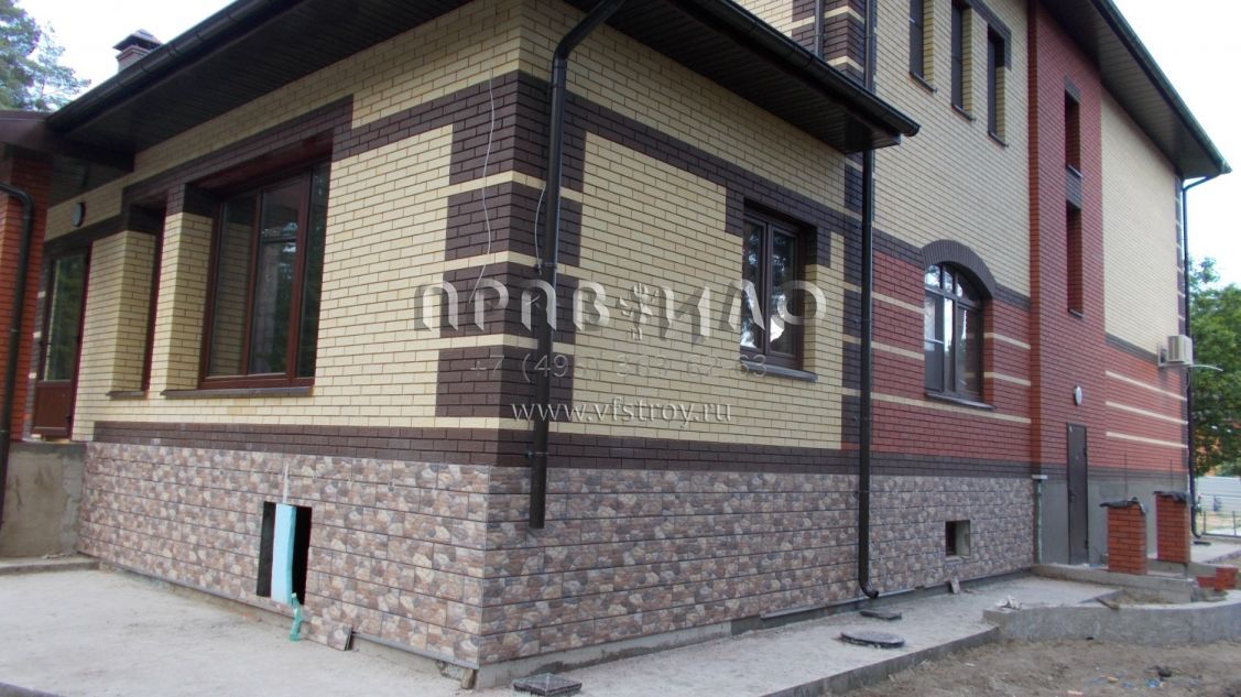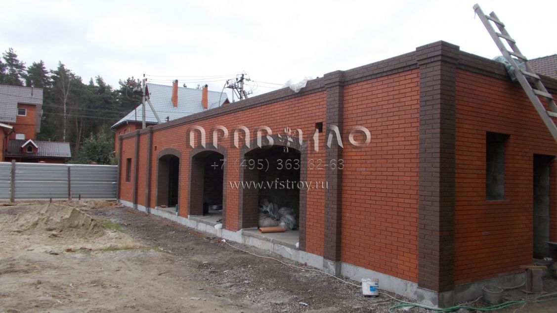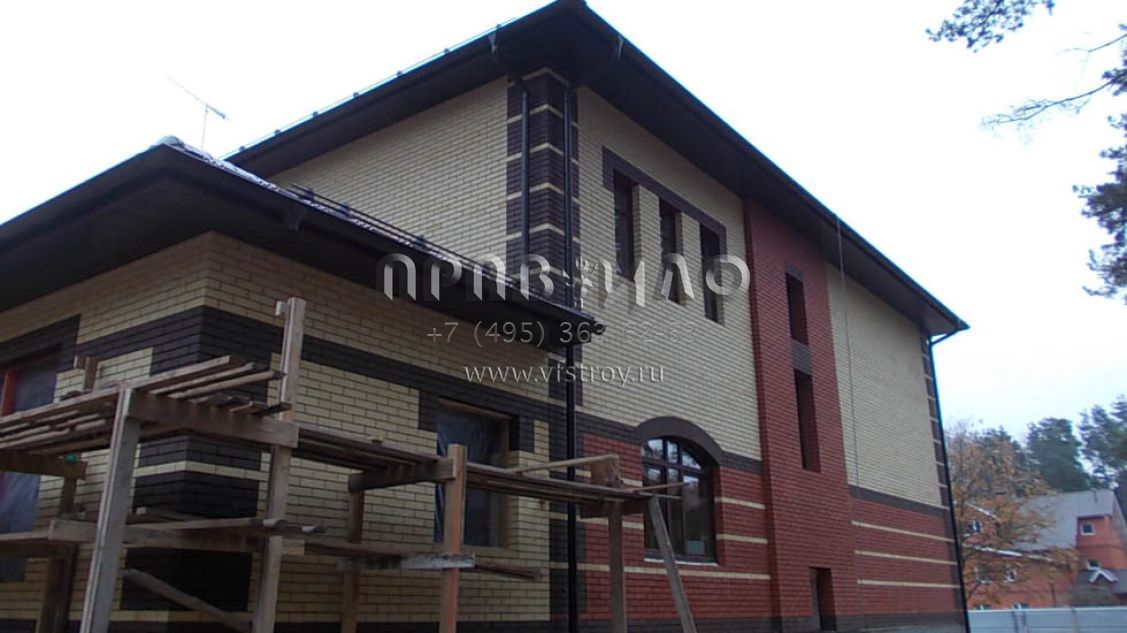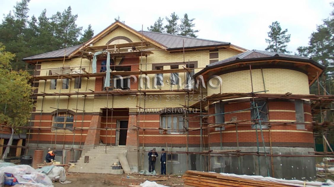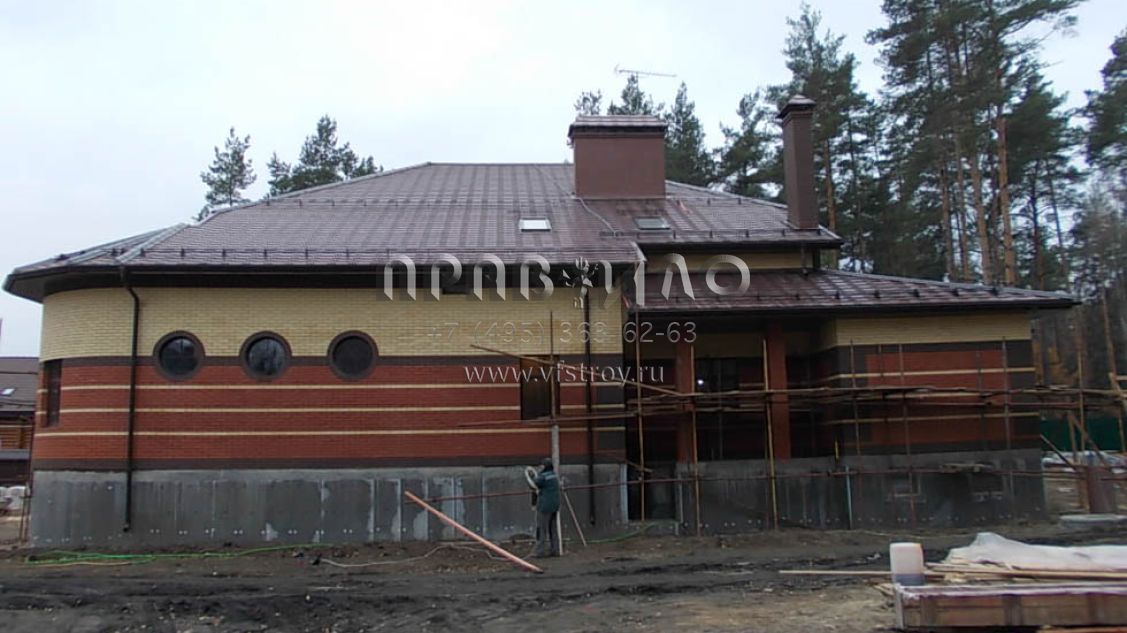 Строительство загородного дома ведется в Раменском районе, вблизи д. Литвиново. Проект загородного особняка с простыми в архитектурном плане, но крепко сбитыми фасадами и ярко выраженным входным порталом. В результате дом смотрится крепким и надежным. В нем имеется просторный цокольный этаж, куда вынесены практически все вспомогательные бытовые и технические помещения. Нашлось место и для установки бильярдного стола. Несомненное достоинство – релаксационный комплекс с большим бассейном. Обязательно стоит выделить и наличие в уровне первого этажа небольшой изолированной квартиры для обслуживающего персонала. На втором этаже расположены три просторные спальни и большая ванная комната.