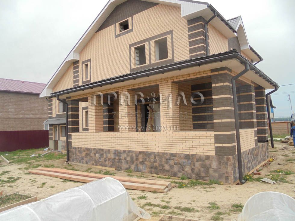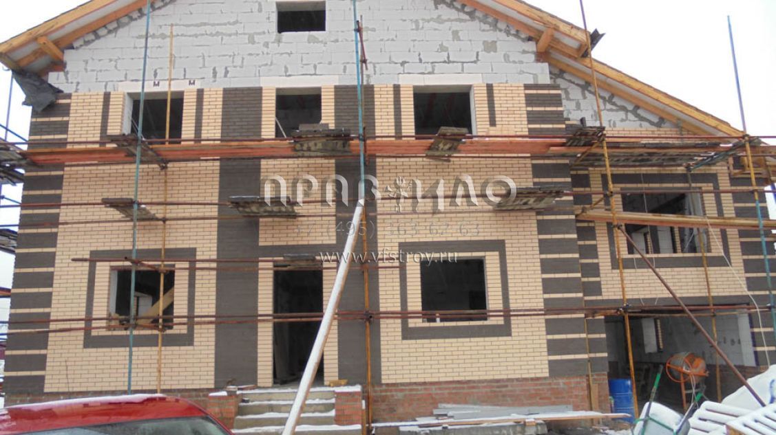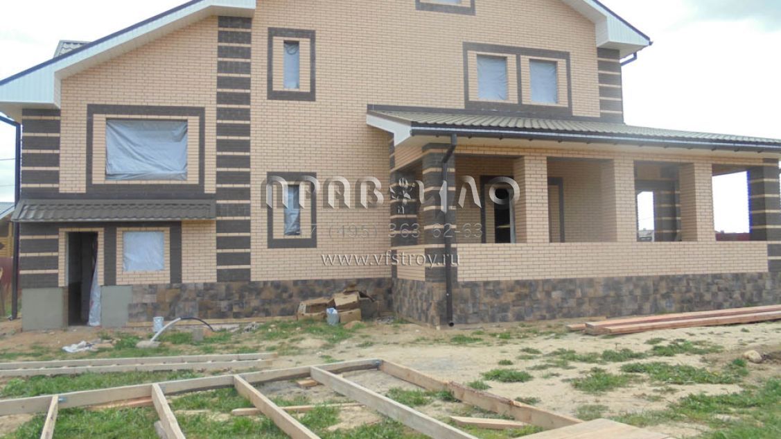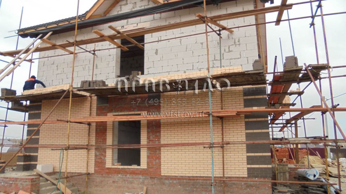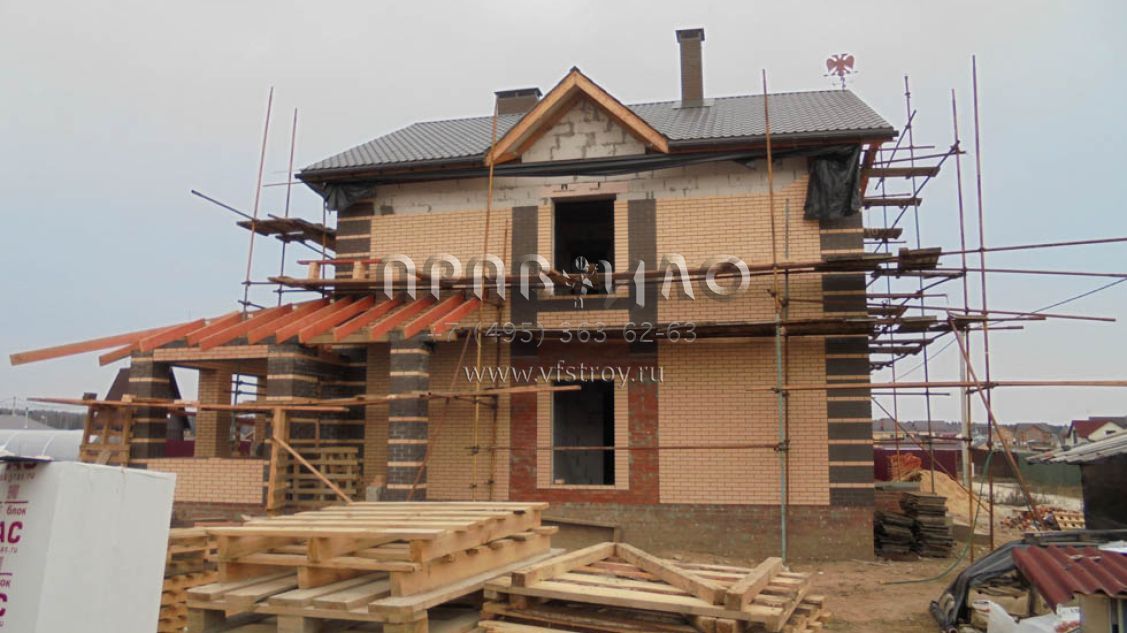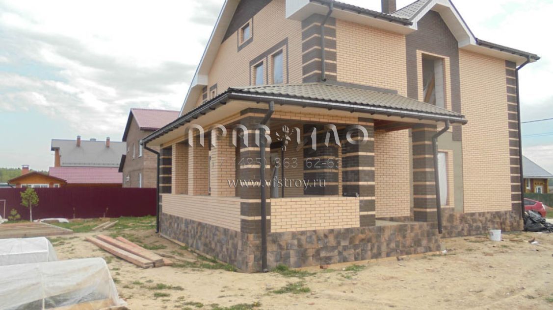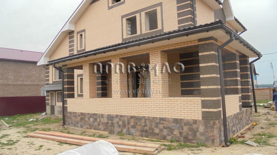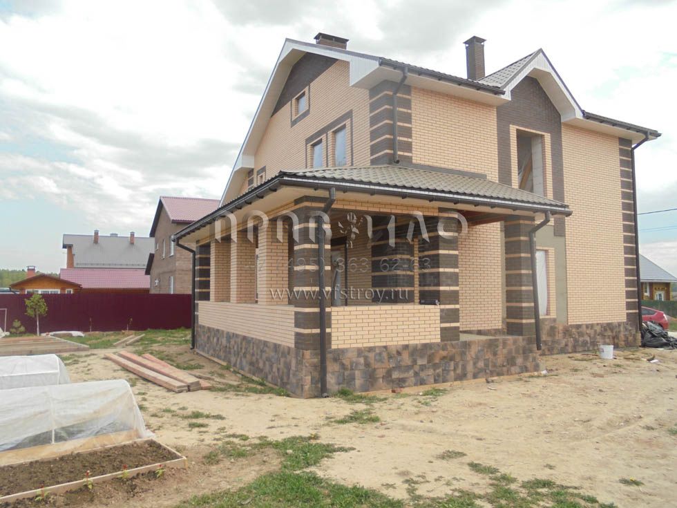 Строительство ведется в Чеховском районе, вблизи д. Ходаево. Небольшой коттедж предназначен для комфортного проживания семьи из 3 - 4 человек. Простота архитектурных очертаний дополняется рустовкой из кирпича и другими декоративными элементами, что создает неповторимый облик здания. Характерной чертой главного фасада является ярко выраженная входная зона с тер-расой, украшенной решеткой. Планировка отличается простотой и удобством. Первый этаж предназначен для дневного пребывания. Наличие спальной комнаты и санитарных удобств на первом этаже позволяет разместиться семье, состоящей из разных возрастных групп. Второй этаж полностью выделен под личные апартаменты, предназначенные для отдыха и сна, со всеми необходимыми удобствами. Особо следует отметить интересное расположение игровой комнаты с оранжереей, находящейся в уровне между первым и вторым этажом.