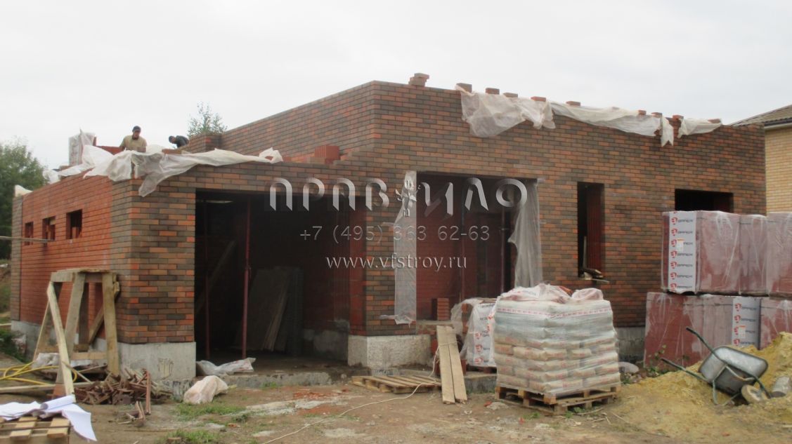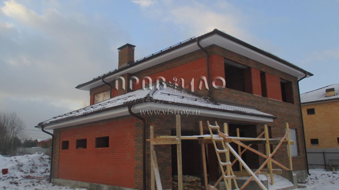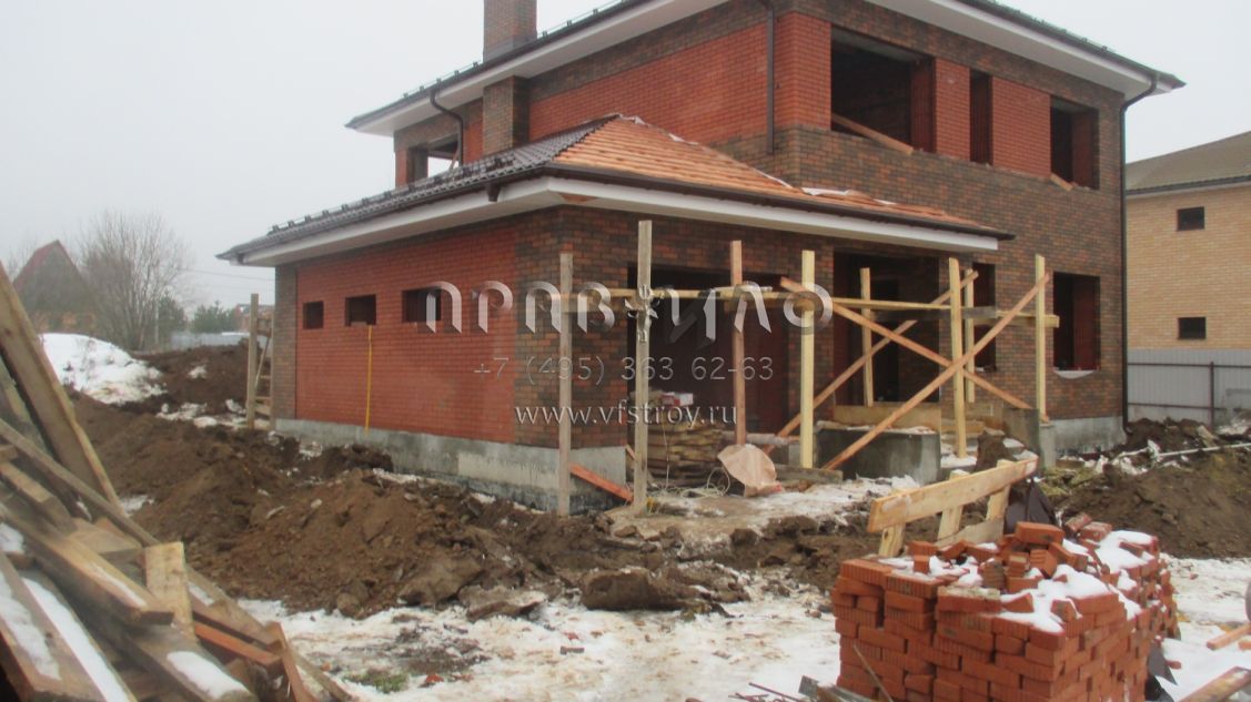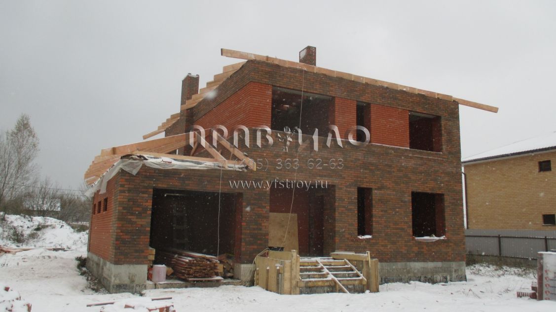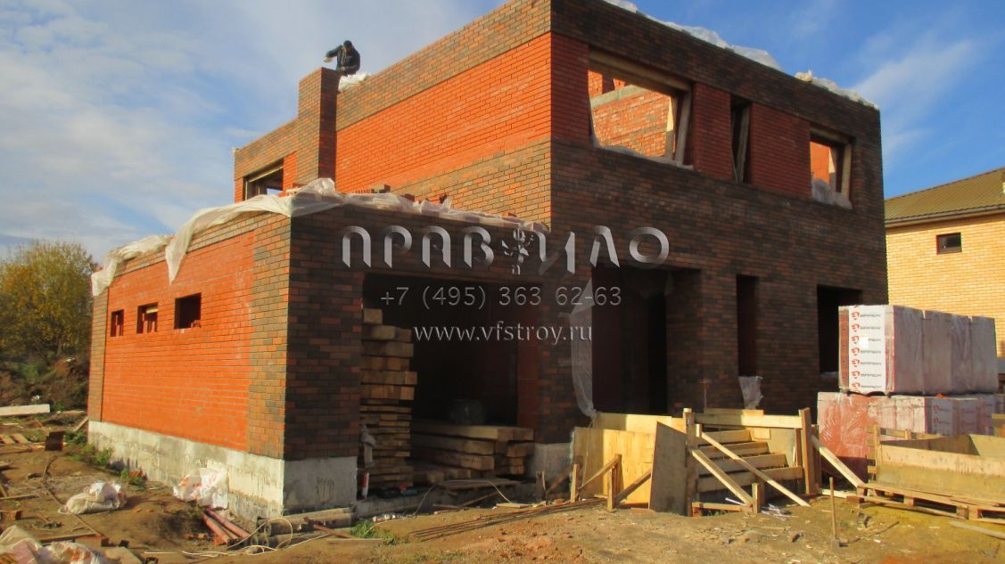 Строительство дома в Раменском районе, поселение Никоновское ведется строительной компанией ВФ-строй. Проект двухэтажного дома. Гармоничная форма здания, гараж с левой стороны и удачная планировка внутри помещения - удобное жильё для семьи, ценящей комфорт и уют. В правом секторе нижнего этажа спроектирована просторная гостиная, соединённая с кухней-столовой. Из гостиной имеется выход на террасу. Кухня дополнена кладовой, через которую практично устроен внутренний вход в гараж. Второй этаж представляет собой зону отдыха. Здесь расположены четыре спальни и ванная комната. Из двух спален имеется выход на террасу второго уровня.